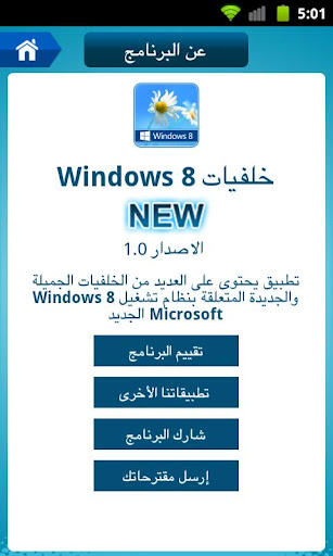 تطبيق للنسخه المنتظره Windows 8 بكل خلفياتها والمفاجأه انه للاندرويد وصف التطبيق تطبيق يحتوى على العديد من الخلفيات الجميلة والجديدة المتعلقة بنظام تشغيل Windows 8 الجديد التى يمكن تعيينها كخلفية للهاتف او مشاركتها مع الأصدقاء . نرجوا من المستخدمين دعم البرنامج بالضغط على الاعلانات أو تقييم البرنامج واقنراحاتكم . لان البرنامج مجانى وشكرا لكم صور من التطبيق https://lh5.ggpht.com/9l5qcQS5hP6dlV...hzCvh9pas=w124 https://lh6.ggpht.com/XtddtFDH-axdgp...6CY_cvn3g=w705 http://lh4.ggpht.com/C9dwOv1hvZo1Zkj...kms8xzydoLztFs http://lh5.ggpht.com/jy1dQE4OyIZqGfF...hB8Thfy6TJIaQx http://lh6.ggpht.com/soODKy001bdqzB8...JeQ34CoKSmm7XM http://lh5.ggpht.com/nYzN1UArFfDKmIr...UDnK12JDEnD_kw http://lh5.ggpht.com/VwcmJcZ-3zawQLu...q25T2cT-9TAzOq http://lh5.ggpht.com/NJJEC8eOOzMkQLb...X2cusGPGnMTcPk http://lh4.ggpht.com/X5P4QNJ8fFIzgqI...g-Pv77RehZ7D3Q http://lh5.ggpht.com/gbmvrtgDYih6JjH...MtkqlMwslsEupg |