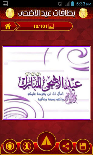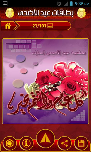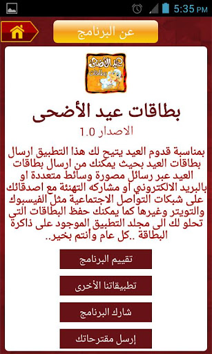 تطبيق بطاقات وتهانى عيد الأضحى اجمل البطاقات للأندرويد وصف عن التطبيق مضت الأيام وأقترب علينا عيد الأضحى المبارك عيد البهجة والفرحة والأضحية وبمناسبة قدوم العيد يتيح لك هذا التطبيق ارسال بطاقات العيد بحيث يمكنك من ارسال بطاقات العيد عبر رسائل مصورة "وسائط متعددة" او بالبريد الالكتروني او مشاركه التهنئة مع اصدقائك على شبكات التواصل الاجتماعية مثل الفيسبوك والتويتر وغيرها كما يمكنك حفظ البطاقات التى تحلو لك الى فولدر التطبيق الموجود على ذاكرة البطاقة ..كل عام وأنتم بخير.. وعساكم من عواده صور من التطبيق https://lh3.ggpht.com/kWjINrRXsOPHtZ...qK8hetBqw=w124 https://lh3.ggpht.com/1oLTD_YNYOPHGS...xIemf648A=w705 https://lh4.ggpht.com/W9ckMaLUbA6zjV...QCQf5OWkBFadfA https://lh6.ggpht.com/mBm-QmMKauzwja...kPM3opkjIif5g0 https://lh4.ggpht.com/_vN05D81Ab4E4R...II89HL2lPjaNUA https://lh6.ggpht.com/rizVBoCf5M1nwD...T9KQKtD8E29QE4 https://lh5.ggpht.com/ir6eFElFccZmYn...SQDyyPPASTmgut https://lh3.ggpht.com/y2iZjC7kCKL4Tb...ImU060YjMnBz_8 https://lh5.ggpht.com/258iDyVazSjUbY...PGa0eglurBq39c تحميل التطبيق من ماركت جوجل بلاى |