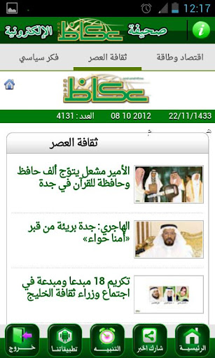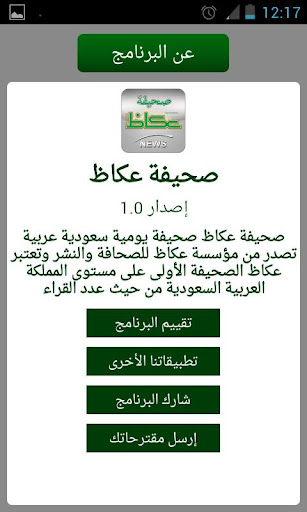 تطبيق صحيفة عكاظ الجديد سهل جدا فى التصفح وبشكل جديد للاندرويد وصف التطبيق صحيفة عكاظ صحيفة يومية سعودية عربية تصدر من مؤسسة عكاظ للصحافة والنشر وتعتبر عكاظ الصحيفة الأولى على مستوى المملكة العربية السعودية من حيث عدد القراء . ويتيح لك التطبيق الدخول الى الخبر او القسم بسهوله بدون خروج البرنامج وايضا الانتقال بين اقسام الصحيفة بسهوله عن الطريق السحب يمينا وشمالا وايضا مشاركه الخبر عن طريق مواقع التواصل الاجتماعى الفيسبوك وتويتر ....وغيرها صور من التطبيق https://lh6.ggpht.com/58Sr84eDRKBJMj...sEDbpnrFQ=w124 https://lh6.ggpht.com/WcAAVdToWO0mMB...57l29YpSQ=w705 https://lh3.ggpht.com/Es3syEWY_X5Bxt...oLL4dcWsdXRHP4 https://lh5.ggpht.com/Zsz81mfxRac5rq...qc6IcW1DVrtnZo https://lh5.ggpht.com/Zsz81mfxRac5rq...qc6IcW1DVrtnZo https://lh6.ggpht.com/uiHG4y7_QRVNuc...5QRSepgKKIPOFw https://lh4.ggpht.com/4mSkS34qz0JJj9...tq_kWt6TipAgpQ https://lh5.ggpht.com/RwUcbao9_CpA-e...Cj5VuP22i41b6y https://lh3.ggpht.com/v-d2FyXC2J7DeP...xVd3_mmeW8KP9w أو تحميله من رابط مباشر APK |