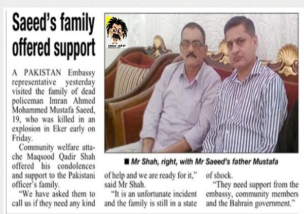 صورة:ممثل السفارة الباكستانية يزور عائلة الباكستاني المقبور Gulf Daly News https://pbs.twimg.com/media/A59YThDCMAA6NMC.jpg:large نشرت صحيفة الجلف ديلي نيوز الصادرة من البحرين أن السفارة الباكستانية أرسلت ممثلا عنها لزيارة عائلة المرتزق الميت "عمران أحمد محمد سعيد"، 19 عاما، الذي قتل في الإنفجار-المزعوم- في قرية العكر المحاصرة ظلما من أكثر من 80 ساعة. ملحق قسم الشؤون الإجتماعية "مقصود قادر شاه" قدم التعازي و الدعم لأسرة المرتزق الباكستاني. و قال ملحق السفارة "طلبنا منهم الإتصال بنا إذا إحتاجوا لأي نوع من المساعدة و سنكون على أتم الاستعداد لتلبيته. "إنها حادثة مؤسفة و العائلة ما زالت في حالة صدمة. " أنهم يحتاجون المساندة من السفارة و أفراد المجتمع و الحكومة البحرينية." ! الصفحة الثالثة..الأربعاء 24 أكتوبر 2012 http://www.gulf-daily-news.com/sourc...pdf/page03.pdf تعليقي: لم أرى وقاحة كهذه الوقاحة ! |