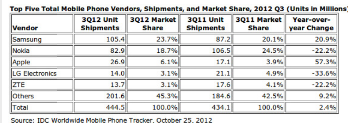 Idc تصدر إحصائية الربع الثالث .. سامسونج تتصدر .. ونوكيا تغادر الخمس الكبار!! بسم الله الرحمن الرحيم كما اعتادت موسسة IDC كل ربع من إصدار إحصائية حول أجهزة الجوال العادية والذكية .. فقد أصدرت أحدث إحصائياتها اليوم .. وهي للربع الثالث من العام 2012 وكانت كالتالي : كل الأجهزة : https://pbs.twimg.com/media/A6HU7nSCUAIxKtj.png:large الأجهزة الذكية : https://pbs.twimg.com/media/A6HTyiICYAAmJN7.jpg - تصدرت شركة سامسونج كلا القائمتين .. الأجهزة العادية والذكية .. فقد بلغ إجمالي مبيعاتها من الأجهزة العادية 105.4 مليون جهاز بنسبة استحواذ 23.7% من السوق .. وهي نسبة نمو من 20.1% في الربع السابق كما تصدرت قائمة البائعين للأجهزة الذكية .. ببيع 56.3 مليون جهاز .. وبنسبة استحواذ 31.3% من السوق .. وهي نسبة نمو من الربع الثاني حيث كانت 22.7% فقط. - نوكيا .. تأتي ثانية في عموم الأجهزة المباعة بعدد 82.9 مليون جهاز .. بنسبة 18.7% وهي نسبة هبوط قوية من 22.2% في الربع السابق. لكن في سوق الأجهزة الذكية ... خرجت نوكيا من قائمة الشركات الخمس الكبرى - أبل .. أتت ثالثة في عموم الأجهزة المباعة بعدد 26.9 مليون جهاز .. وبسبة استحواذ 6.1% فقط من السوق .. وهي نمو كبير عن الربع السابق . لكنها أتت ثانية في مبيعات الأجهزة الذكية ببيع نفس العدد طبعاً 26.9 مليون جهاز وهو يشكل 15% من سوق الأجهزة الذكية .. وهو نمو عن الربع السابق - خلت القائمتين من شركة سوني وموتورولا.. http://www.blogcdn.com/www.engadget....1351238676.jpg ما تعليقكم ؟ :) . |