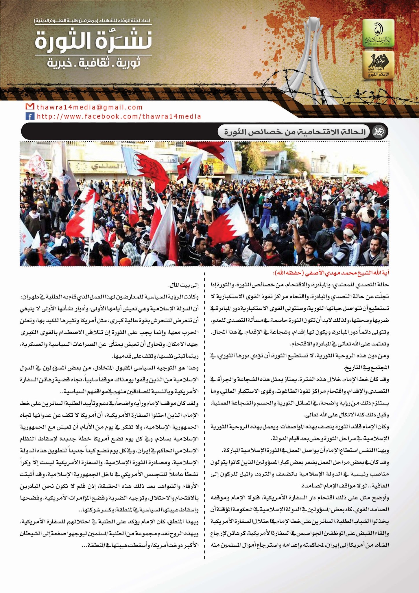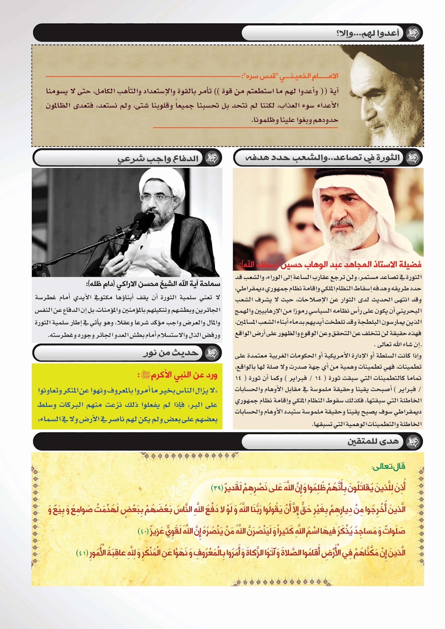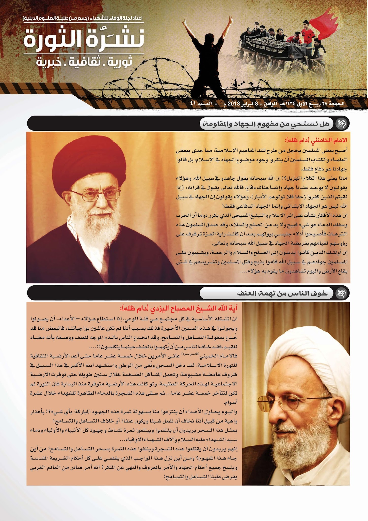 الإعلام الثوري:: نشرة الثورة العدد 41 Thawra Media :: الإعلام الثوري نشرة الثورة :: العدد 41. إعداد: ...:(لجنة الوفاء للشهداء):... جمع من طلبة العلوم الدينية .. الصفحة الاولى: - الإمام الخامنئي: هل نستحي من مفهوم الجهاد و المقاومة. - الشيخ مصباح اليزدي: خوف الناس من تهمة العنف. http://bit.ly/WCBVil الصفحة الثانية: - الامام الخميني: أعدوا لهم ... وإلا!. - الأستاذ عبد الوهاب حسين: الثورة في تصاعد..والشعب حدد هدفه. - الشيخ محسن الأركي: الدفاع واجب شرعي. http://bit.ly/Wax71H الصفحة الثالثة: - الشيخ محمد مهدي الآصفي: الحالة الاقتحامية من خصائص الثورة. http://bit.ly/WaxJ7y الصفحة الرابعة: - الشيخ عيسى قاسم: الحل هو المقاومة. - من كلمة تيار الوفاء الإسلامي. - بيان الغضب... لجنة الوفاء للشهداء ( جمع من طلبة العلوم الدينية). http://bit.ly/WCD5u0 لتحميل النشرة: 4shared: http://to.ly/j6Gw ساهم في نشر الفكر الثوري الأصيل |