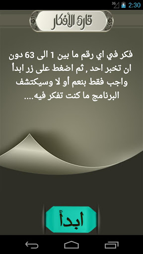 تطبيق قارئ الافكار الجديد بتصميمه الرائع [CENTER] وصف التطبيق تطبيق يقوم بقرائة ما تفكر فيه . عن طريق تحديد رقم فى ذهنك من 1 الى 63 . وسوف يخبرك البرنامج هذا الرقم >> صور من التطبيق https://lh6.ggpht.com/Gbw_kYsaQM-bos...5UoSzLhBA=w124 https://lh5.ggpht.com/9EXLuQGJvFPTsO...MvzcsbFyg=w705 https://lh3.ggpht.com/K0biYhzWRMmYSf...bgeECIL7CE-sp0 https://lh5.ggpht.com/df8H9fwlF_XZ4G...MsJbcJ-KJF1-om https://lh6.ggpht.com/xv0WhInVRCbVmY...vtpKodRULj5Bpk https://lh5.ggpht.com/zmDhNVmT7p5yrq...7tyYcTZkNtg1bM https://lh3.ggpht.com/kjn52CN4Wu5OXZ...UgXW2q0iMklv7z https://lh5.ggpht.com/5cLSyNuiEPUhUi...oE66gl6NaJaTDs |
