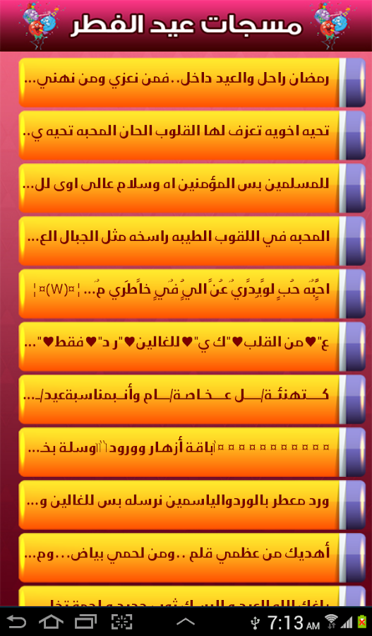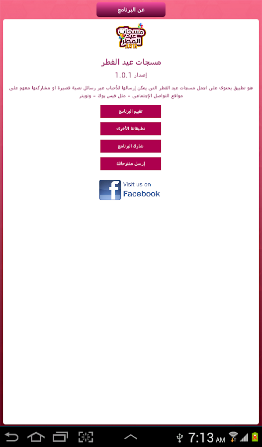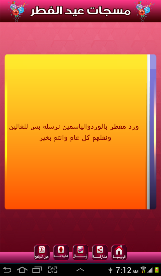 حمل تطبيق مسجات عيد الفطر 2013 [center] وصف التطبيق بمنــــــاسبة عيد الفطـــر المبـــــارك أعاده الله علينــــا باليمنِ والبركــات نهديكم اجمل مسجات عيد الفطر التى يمكن إرسالها للأقارب والاصدقاء والاحباب عبر رسائل نصية قصيرة او مشاركتها معهم على مواقع التواصل الإجتماعى - مثل فيس بوك - وتويتر ..وواتس اب وغيره.... مميزات التطبيق مزايا التطبيق: 1- عشرات رسائل تهنئة العيد . 2- إمكانية الإرسال مجانا من خلال whatsapp و viber و skype وغيرها. 3- مشاركة الرسائل على مواقع فيس بوك وتويتر facebook , Twitter . 4- إمكانية الإرسال مباشرة من جهازك الجوال دون الحاجة لإعادة الكتابة. تحميل التطبيق من متجرجوجل بلاى http://www.google.com.eg/imgres?sa=X...15&tx=75&ty=37 صور من التطبيق https://lh3.ggpht.com/il5AtsvcrvsKkb...BrSUUw=w300-rw https://lh4.ggpht.com/7YBI5bgpY8K4G2...cCJXmA=h900-rw https://lh3.ggpht.com/hRtMCWhbQRJz7x...Egq9ZJ=h900-rw https://lh6.ggpht.com/08HiOAkMq8OJn0...Jiwi8Q=h900-rw https://lh3.ggpht.com/shwnd7e_N6lwq3...KcHQmm=h900-rw |