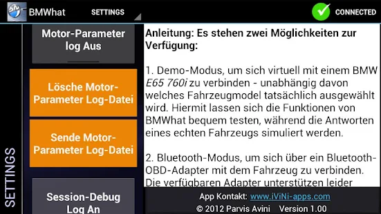 BMWhat v6.05 APKالتطبيق الاروع لسيارات BMW مدفوع هذا الموضوع للإفادة لاني لا اتقن الإنجليزية لذلك لم اشرحه بالعربي سعره في https://play.google.com/store/apps/d...whatFull&hl=fr Lesen Sie BMW Fehlermeldungen (Fault Codes, DTCs) wie die Experten aus. Normale OBD Tester sind limitiert auf eine kleine Anzahl von elektronischen Steuergeräte (ECUs) und auf eine noch kleinere Anzahl an Fehlermeldungen. Dieses App liest praktisch alle kompatiblen ECUs aus. Normalerweise ist dies nur mit teurer Expertenausrüstung möglich. Nun können aber auch Sie eine detaillierte Autodiagnose selber durchführen. Es werden Modell-spezifische Fehlercode-Beschreibungen angezeigt. ...und Sie können sogar die gespeicherten BMW spezifischen Fehler Codes löschen - nicht nur OBD Codes! Die wesentlichen Funktionen sind: - Auswahl aus über 100 verschiedenen BMW Modellen - Identifizierung aller kompatiblen ECUs - Durchführung von Tiefendiagnosen für BMW Fehlercodes - Anzeigen von Modell-spezifischen Fehlertexten - Versenden des Fehlerprotokolls per E-Mail - Löschung der BMW Fehlercodes Als noch kostenloses add-on kann man ausgewählte Motor-Parameter in Echtzeit anzeigen lassen wie es in der Demo gezeigt wird. Wenn in der kostenlosen Lite Version der Motor identifiziert wurde und die RPM Anzeige funktioniert, dann kann man in der Vollversion auch die anderen Motor-Parameter anzeigen lassen. WICHTIGER HINWEIS Prüfen Sie zunächst mit der KOSTENLOSEN Lite-Version die Kompatibilität der Vollversion BEVOR Sie diese kaufen. Die Lite Version identifiziert alle kompatiblen Steuergeräte und ermittelt die Anzahl aller gefundenen Fehler Codes. Damit können Sie sicher sein, dass die Vollversion mit dem verwendeten Bluetooth-Adapter und dem angeschlossenen Fahrzeug funktioniert. Bei Fragen senden Sie uns bitte einfach eine email an [email protected] Kompatibilität Die folgenden BMW Modelle wurden erfolgreich mit der BMWhat Tiefen-Diagnose ausgelesen: 1er: E81, E82 1er Cabrio: E87 1er Coupe: E88 3er: E90 3er Touring: E91 3er Coupe: E92 3er Cabrio: E93 5er: E60 5er Touring: E61 6er: E63 6er Cabrio: E64 7er: E65, E66 X5: E70 X6: E71, E72 MINI NEU * NEU * NEU * NEU E46, E39 und andere ältere Modelle - nun mit USB-OBD Kabel-Verbindung! Diese genannten Modelle sind in der Regel kompatibel mit dem App. *** Testen Sie bitte die Kompatibilität mit der kostenlosen BMWhat lite version, bevor Sie die Vollversion kaufen. http://2.bp.blogspot.com/-gs0Oa-fGzU...ogspot.com.jpg https://lh6.ggpht.com/7gDdGTlmwZm6Ok...6e_aZg=h310-rw https://lh6.ggpht.com/urfSY_EiFzjgtV...RTWw9w=h310-rw https://lh3.ggpht.com/mRYKtBSlWHb1yR...tU2d1A=h310-rw https://lh5.ggpht.com/RxsCuqrpaN2u1M...wsMS9S=h310-rw https://lh4.ggpht.com/iCLFSHnpTM7juo...XDNVMs=h310-rw http://mizmani1.magix.net/public/apk...ogspot.com.png BMWhat v6.05 APK Download APK+OBB Size: 3.8 MB +Required Android O/S : 2.1 http://mizmani1.magix.net/public/dwnld.jpg لا اعلم ان كان يوافق سيارتي هاته http://gallery.egyroom.com/helwan/helwan14.jpg طريقة فك الضغط عن ملفات الداتا ونقلها على مجلد obb بدون مشاكل وبسهولة للأندرويد نحتاج برنامج ES File Explorer File Manager لفك الضغط Download ES File Explorer File Manager Size: 4.1 MB شاهد الفيديو APK+OBB- YouTube |