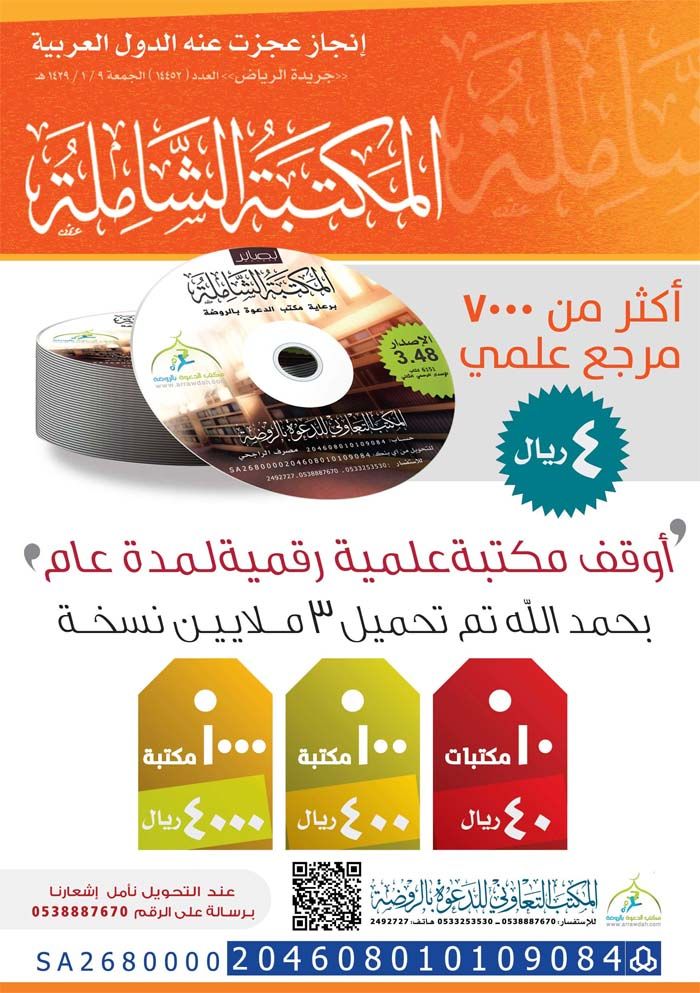 عاجل : يا يا يا باغي الجنة ، صدقة جارية في المكتبة الشاملة الرقمية ب 4 ريال فقط - ماذ بسم الله الرحمن الرحيم فرصة وغنيمة باردة ... أليس الدال على الخير كفاعله... إذن ساعدونا في نشر الموضوع في المنتديات والإيميلات والقروبات لتكون معهم شريكا بالأجر هل تعلم أنك تستطيع وقف نسخة في المكتبة الشاملة لمدة عام بـ 4 ريال فقط شاملة اِلتحديثات والكتب المضافة تم تحميل 3 ملايين نسخة من المكتبة الشاملة عن أبي هريرة رضي الله عنه قال : قال رسول الله صلى الله عليه وسلم ( إذا مات الإنسان انقطع عمله إلا من ثلاثة : صدقة جارية , أو علم ينتفع به , أو ولد صالح يدعو له ) رواه مسلم . المكتبة الشاملة برنامج مجاني ضخم ( برعاية المكتب التعاوني للدعوة والإرشاد وتوعية الجاليات بحي الروضة ) يهدف ليكون شاملاً لكل مايحتاجه طالب العلم من كتب وبحوث . وهذه صفحة المشروع في موقع مكتب جاليات الروضة الرسمي http://www.arrawdah.com/dimofinf/page.php?do=show&action=shamela http://www.islamnor.com/vb/mwaextrae...rames/tr13.gif http://www.islamnor.com/vb/mwaextrae...rames/tl13.gif فرصة وغنيمة باردة ... أليس الدال على الخير كفاعله... إذن ساعدونا في نشر الموضوع في المنتديات والإيميلات والقروبات لتكون معهم شريكا بالأجر http://www.islamnor.com/vb/mwaextrae...rames/br13.gif http://www.islamnor.com/vb/mwaextrae...rames/bl13.gif مميزات المكتبة الشاملة : - فيها أكثر من 7000 مرجع علمي - تم تحميل 3 ملايين نسخة - مجانية . - مرنه وقابله للإضافات الخاصة - التحديثات والمتابعة المستمرة . - سهولة الاستخدام . - دقة محرك البحث . – خفة برنامجه على الجهاز . http://i769.photobucket.com/albums/x...jpg%7Eoriginal أرقام من المكتبة الشاملة : 250000 عدد زوار الموقع الرسمي شهرياً للمكتبة. 15000 عدد الزوار يومياً . 3000000 عدد زيارات موقع تصفح الكتب . 2438000 عدد مرات التحميل للمكتبة 6200 عدد الكتب بالمكتبة . صور من داخل المكتبة : http://i769.photobucket.com/albums/x...jpg%7Eoriginal http://i769.photobucket.com/albums/x...jpg%7Eoriginal وهذه صفحة المشروع في موقع مكتب جاليات الروضة الرسمي وفيه أرقام حساباتهم وكيفية التبرع لهم http://www.arrawdah.com/dimofinf/page.php?do=show&action=shamela للاتصال والاستفسار على الأرقام التالية : جوال : 0538887670 جوال : 0533253530 هاتف ثابت : 0112492727 http://www.islamnor.com/vb/mwaextrae...rames/tr13.gif http://www.islamnor.com/vb/mwaextrae...rames/tl13.gif فرصة وغنيمة باردة ... أليس الدال على الخير كفاعله... إذن ساعدونا في نشر الموضوع في المنتديات والإيميلات والقروبات لتكون معهم شريكا بالأجر http://www.islamnor.com/vb/mwaextrae...rames/br13.gif |