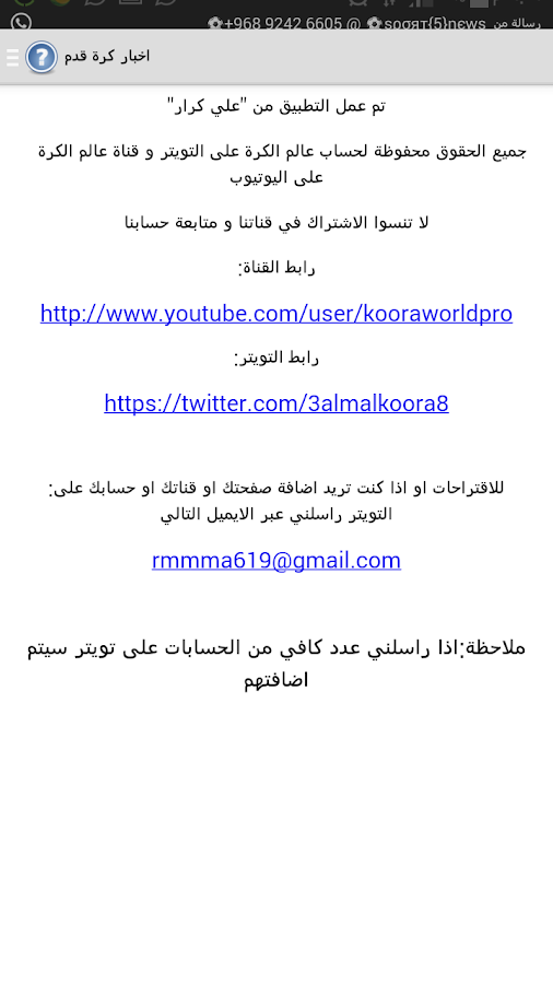 تحميل اكبر برنامج اخبار كرة قدم على الاندرويد يسرنا ان نقدم لكم تطبيق " أخبار كرة القدم " و الذي يعتبر مصدر عملاق لمعرفة أخبار المستديرة . تم تطوير البرنامج ليشمل أقسام متعددة و يحتوي على العديد من صفحات الفيسبوك و قنوات اليوتيوب و هي صفحات تخص العديد من الفرق العالمية كميلان,برشلونة,ريال مدريد,ليفربول,مانشستر يونايتد,تشيلسي,انتر ميلان و بايرن ميونخ والعديد من الفرق الاخرى و يحتوي ايضا على صفحات عامة و مواقع مشهورة في كرة القدم صور التطبيق: https://lh4.ggpht.com/4GLa6hK-j5zrqw...yxRmRM=h900-rw https://lh4.ggpht.com/BCPPDilJ_EfNIk...bg7kVw=h900-rw https://lh5.ggpht.com/5C8HmTtoOAr4wX...65kvxY=h900-rw https://lh6.ggpht.com/789cOhgO4N3vp1...24GcGV=h900-rw مميزات التطبيق: يمكنك اختيار الصفحة التي تريدها يمكنك رؤية جميع الاخبار التي مرت في 24 ساعة يمكنك تفضيل خبر لرؤيته لاحقا يمكنك تغير تخطيط عرض الاخبار يمكنك رؤية الاخبار الغير مقروئة يمكنك تحديث جميع الاخبار بزر واحد يمكنك تحديث صفحة واحدة يمكنك زيارة موقع الخبر يمكنك رؤية الفيديو من البرنامج مباشرة. يمكنك تغير النمط ووضع النمط الخاص بك. يمكنك اختيار وقت تلقائي لتحديث التطبيقات يمكك مسح الاخبار يمكنك البحث عن الاخبار يمكنك اختيار نغمة عند نزول خبر جديد يمكنك ارسال الاخبار عبر مختلف الوسائل مثل (واتس اب- تويتر). يوجد هناك قسم فرعي خاص بالالعاب تم وضعه دعما لناشر التطبيق. رابط التطبيق عبر جوجل بلاي: â–ھhttps://play.google.com/store/apps/d...ora.world.news لدعمنا قم بالضغط على الاعلانات المنبثقة اثناء تصفحك البرنامج . و لا تنسوا تقيم التطبيق في جوجل بلاي.. *********************************** ارجوا مراسلتي للاقتراحات او لاضافة صفحتك على فيسبوك او قناتك او حسابك على التويتر على الايميل التالي: [email protected] *********************************** |