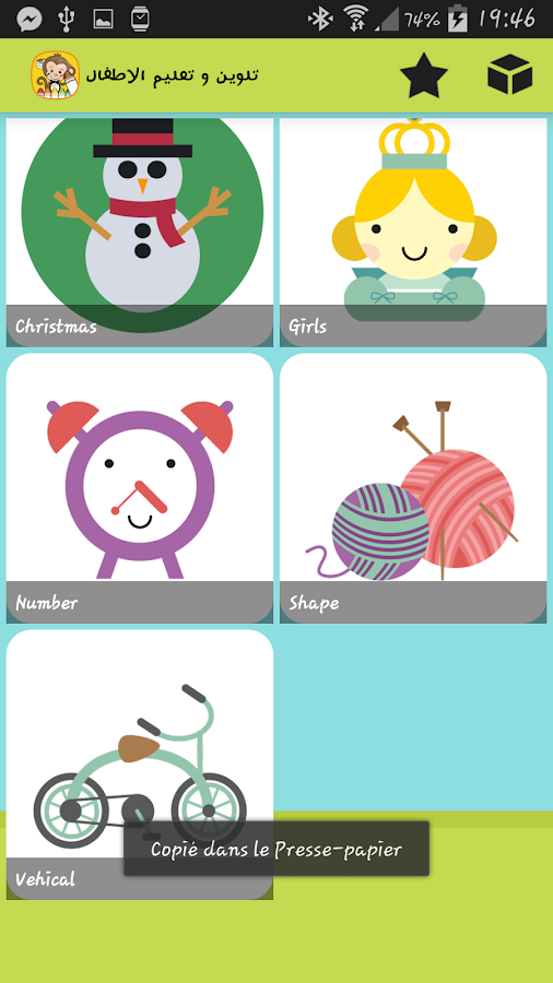 تطبيق تلوين و تعليم الاطفال تلوين و تعليم الاطفال التلوين و تعليم للأطفال لعبة لا غنى عنها لاي طفل بل و يعشقها الكبار ايضا. تستطيع من خلال مجموعة كبيرة من الصورة و الالوان تلوين الصور و تعريف طفلك على الحيوانات و تلوينها. يحتوي التطبيق على الكثير من صور الكارتون و الحيوانات الإنجبيزية مثل سبونج بوب و بن تن و القطة و ماريو و الجمل و غيرها تستطيع ان تحفظ الصورة او مشاركتها من خلال الفيسبوك او تويتر او البلوتوث او ارسالها رسالة مصورة البرنامج يتوفر على الكثير من الأقسام و الصور و سيتم اضافة الكثير فيما بعد https://lh5.ggpht.com/JwrqluVhQ3Xcu8...OGU-eeEAM=h900 https://lh6.ggpht.com/eWVkpIjA-4V31M...u4_Mw-vpw=h900 https://lh4.ggpht.com/gkUkYYwcfNOSgG...e5m16ZFmA=h900 https://lh3.ggpht.com/E3IN1hXzZryRwP...Fc6VCIstO=h900 https://lh4.ggpht.com/MqZkq08HKpbnP2...qGAQZ7m5v=h900 تحميل التطبيق |