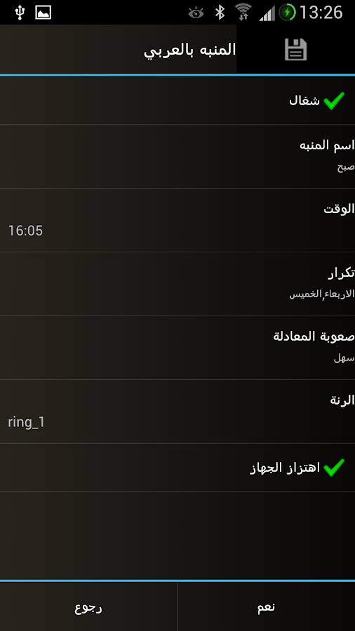 المنبه العربي (ساعة منبه) https://lh3.ggpht.com/HP3saN6CXBxopO...datYWeDSA=h900 التطبيق الاول لساعه المنبه بالعربي ما يميز التطبيق هو: البساطه بالتعامل. ميزة لاصحاب النوم الثقيل هو اختيار معادله حسابيه ، ويجب حلها اولا قبل إطفاء المنبه. المعادله بثلاث مراحل: سهل ، وسط ، صعب.. او يمكنك تبطيل ميزة المعادله. ** بدون دعايات او دفع ** نرجو ان ينال اعجابكم. تحميل الملف بصيغة: APK |