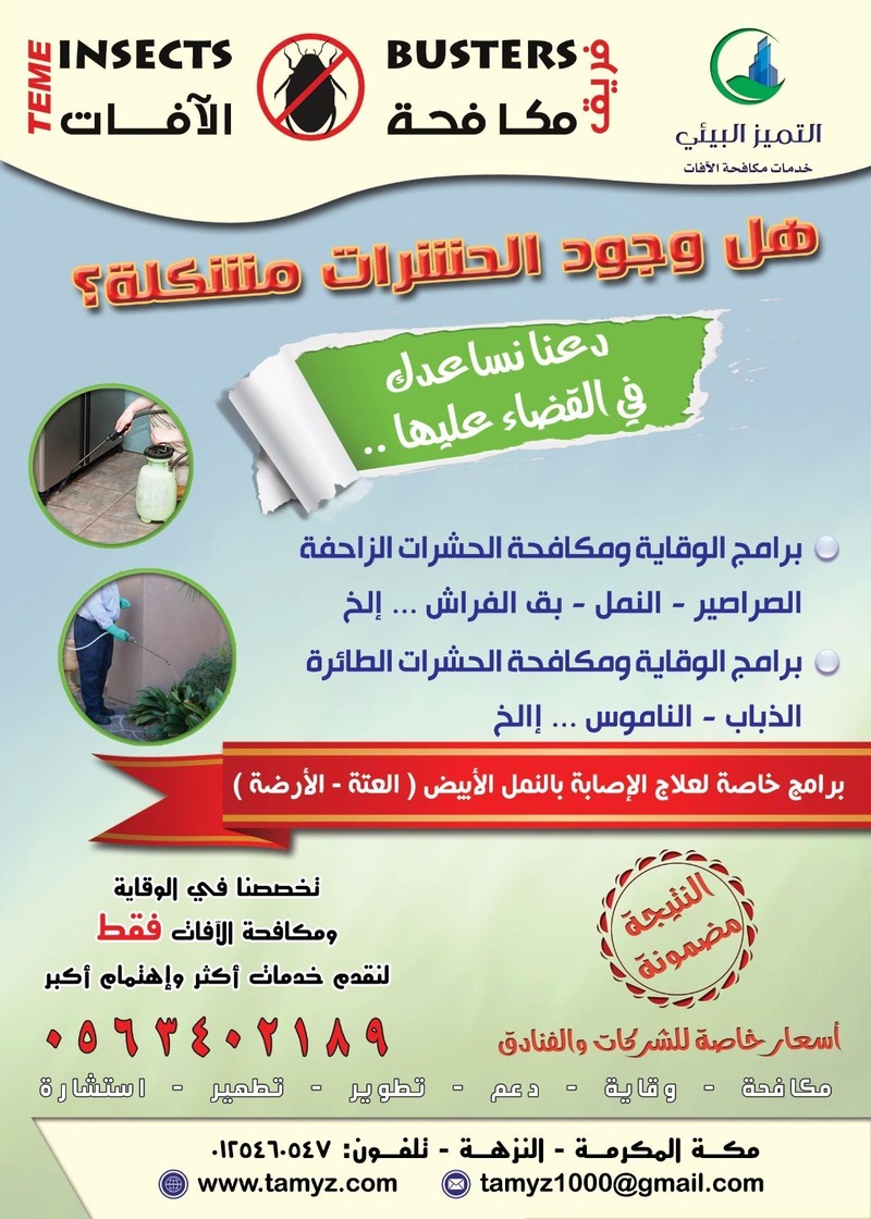 افضل شركة مكافحة حشرات بمكة 0563402189 http://store2.up-00.com/2016-10/1475659593781.gif يمكنكم الاعتماد على افضل شركة مكافحة حشرات بمكة المكرمة 0563402189 هل تبحث عن افضل شركات مكافحة الحشرات بمكة المكرمة لتقوم بحل المشاكل المتعلقة بأضرار الحشرات في المنزل فمن المعروف ان المملكة العربية السعودية تعد من البيئات الحارة والصحراوية والتي تكثر بها الحشرات و تسبب الكثير من المضايقات والأضرار و منها ما هو ناقل للأمراض والعدوي وتعد شركتنا من أفضل شركات مكافحة الحشرات داخل مكة شرقا و غربا وشمالا و جنوبا . افضل شركات مكافحة الحشرات بمكة مؤسسة التميز البيئي لمكافحة الآفــات ظ…ظƒط§ظپط*ط© ط§ظ„ط*ط´ط±ط§طھ | ط§ظ„طھظ…ظٹط² ط§ظ„ط¨ظٹط¦ظٹ نتميز بالتخصص في مكافحة الحشرات نقدم مواد المانية وامريكية معتمدة جميع المواد آمنة وصديقة للبيئة بدون رائحة لاداعي لترك المنزل عمالة فنية مدربة زورنا في موقعنا للتعرف علينا اكثر لدينا اسعار مناسبة للجميع هذا العام 1438هـ اتصل مباشرة 0563402189 https://i.suar.me/qgVx/m مكافحة حشرات بمكة - مكافحة فئران - مكافحة النمل الابيض - مكافحة العتة - مكافحة الزواحف |