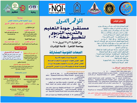 اقوي مؤتمر جودة التعليم و التدريب التربوي مستقبل التعليم و التدريب التربوى ج القاهرة يعقد ( المؤتمر الدولى بعنـوان : مستقبل جودة التعليم و التدريب التـربوى لتـطبيق خطة2030 البداية الخميس القادم 26– 4 – 2018 و الجمعة 27 – 4 - 2018 انضم للنخبة فى المجال التربوى ( التعليم – التربية العامة – التربية الخاصة ) حصرياااا بجامعة القـاهرة– المؤتمر .. خصم كبييير للمجموعات و النقابات و المؤسسات عمالقة التعليم و التدريب التربوى فى الوطن العربى يلتقون تحت سقف مؤتمر واحد خصم خااااص جداااا للوزارات و النقابات و المجموعات عدد 30 فأكثر انضمامك = استفادة مباشرة و لا محدودة بالاحتكاك بخبرات علمية و عملية و تشريعية رفيعـة - حضور دولى واسع - بحضور نخبة من عمالقة التعليم و التدريب التربوى فى الشرق الأوسط ، ( فى مجال التدريب و التعليم التربوى ( التربية العامة / التربية الخاصة/ و علم النفس و معايير الجودة التربوية و التدريبية ) - وورش عمل رفيعة المستوى ومميزة على مستوى الوطن العربى - إمكانية الحضور المباشر و أونلاين - شهادة موثقة - إمكانية تقديم أوراق عمل - أبحاث علمية https://i.suar.me/vaMaW/l برجاء الجادين فى الانضمام سواء مشاركة - أو مشاركة بورقة عمل - أو تقديم بحث - أو رعاية سرعة تأكيد الحجز بسداد الرسوم و تسجيل بياناتهم و صورة البطاقة و و تسليم الأبحاث الراغبين فى المشاركة بها أو أوراق العمل - آخر يوم لتقديم الأبحاث رابط التسجيل فى الاستمارة : xDxOP رابط الايفنت : uX2ov الموقع الالكترونى لواحة التميز للتدريب : ظˆط§ط*ط© ط§ظ„طھظ…ظٹط² ظ„ظ„طھط¯ط±ظٹط¨ المؤتمر الدولى بجامعة القاهرة 26 ،27 إبريل 2018 م رئيــــس المــــــؤتمـــر برئاسة معالى وزير التعليم العالى والبحث العلمى الأستاذ الدكتور / السيد عبد الخالق الأسبق نائب رئيـــــس المـــؤتمـــر أ.د محمـــد عتمـــــــــان رئيس مجلس الإدارة بالمعهد القومى للجودة وزارة التجارة والصناعة أمـــــين عــــام المـــــؤتمــــر أ .د طـــارق الحصرى نائب رئيس مجلس الإدارة بالمجلس الوطني للتدريب و التعليم ووكيل كلية الدراسات العليا في الإدارة بالأكاديمية العربية للعلوم والتكنولوجيا والنقل البحري جامعة الدول العربية ، ومستشار وزير التخطيــــط سابقا https://i.suar.me/PEmEQ/l رئيــــــس اللجنــــة العلمــــية أ.د ليلـــى لطفـــــى رئيس أكاديمية السادات والعلوم الإدارية اللجنــــة العلمــــــــية أ.د نبيـــــل الـــــــزهار عميد كلية التربية الخاصة جامعة مصر للعلوم والتكنولوجيا عميد كلية تربية الإسماعيلية و تربية جامعة 6 أكتوبر الأسبق وسفير المجلس الدولي لعلماء علم النفس بمصر الأستاذ الدكتور عـــــلاء الــدين سعــد متـــولى أستاذ مناهج و طرق التدريس بكلية التربية جامعة بنها و مدير مركز تنمية قدرات أعضاء هيئة التدريس و القيادات جامعة بنها الدكتور / أحمــــد آدم الشنـــدويلي مدير عام بالإدارة المركزية للتربية الخاصةبوزارة التربية و التعليم ومستشار وزير التربية والتعليم السابق / محمد السيد شريف المستشار الإعلامى المدير التنفيذى للمجلس الوطنى للتدريب والتعليم المنسق العام للمؤتمر أ تــــامر محمــــد فـــــوزى مدير واحـــــــة التمــــــيز للتدريب و الاستشارات مدرب محترف الجهات القومية المشاركة : أكاديمية السادات للعلوم الإدارية- المعهد القومى للجودة التابع لوزارة التجارة و الصناعة- المجلس الوطنى للتدريب والتعليم و بعضويته 5 وزارات- - الجمعية العامة للتنظيم والإدارة . https://i.suar.me/pXdXy/l : محــــاور المــــؤتمر الطرق الحديثة فى إدارة التعــليم والتـدريب التـربوى من منظـور المعـايير الــدولية للجودة التقـــــنيات الحــــــديثة فى التـــدريب والتعلـيم طبقــا لمعــايير الجـــــــودة الشــــــاملة . مستقبل التدريب المهنى ( الــــتربية العامــة و الـــتربية الخاــة – التنميــــة البشــرية ) . تطوير التربية الخاصة : من خلال قضايا : الــــد مــــــــــج . التنمية المهنية لل