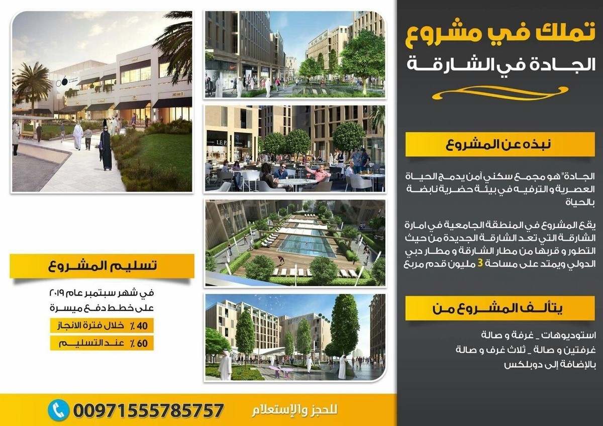 الواجهة الجديده العصرية للشارقة سارع بتملك شقتك في مشروع الجادة بالشارقة من شركة أرادا للتطوير العقاري وبالتقسيط المريح https://i.suar.me/Nl264/l للاستعلام والاتصال او واتس اب : 00971555785757 تحت رعاية وحضور صاحب السمو الشيخ سلطان بن محمد القاسمي عضو المجلس الأعلى حاكم الشارقة . تم بحمد الله إطلاق الواجهة الجديدة العصرية للشارقة في منطقة الشارقة الجديدة ( مشروع الجادة العقاري ) يتضمن المشروع إطلاق شقق سكنية استوديو غرفة وصالة غرفتين وصالة ثلاث غرف وصالة وفلل وتاون هاوس من غرفتين وثلاث غرف خطط دفع ميسرة تبدأ من ١٠٪ فقط مع إمكانية التمويل البنكي بالشراكة مع مصرف الشارقة الاسلامي نبذة عن المشروع: الجادة" هو مجمع سكني آمن يدمج الحياة العصرية ووالترفيه في بيئة حضرية نابضة بالحياة. يقع المشروع في المنطقة الجامعية في امارة الشارقة التي تعد الشارقة الجديدة من حيث التطور و قربها من مطار الشارقة و مطار دبي الدولي ويمتد على مساحة 3 مليون قدم مربع. يضم المشروع خدمات ترفيهية و ثقافية(مقاهي، مطاعم، ممشى، نوادي صحية، حدائق و حضانة للأطفال) . يتألف المشروع من استوديوهات، غرفة و صالة، غرفتين و صالة، ثلاث غرف و صالة ، بالضافة الى دوبلكس. تسليم المشروع سيكون في شهر سبتمبر عام 2019 و على خطط دفع ميسرة 30% خلال فترة الانجاز و 70% عند التسليم مع إمكانية التمويل عن طريق بنك مصرف الشارقة الاسلامي دراسة المشروع: المشروع هو من أهم المشاريع الاستثمارية في المنطقة حيث يقع في المنطقة الجامعية التي تضم 30000 طالب و معلم و مقابل ثاني أكبر ستي سنتر في الامارات الذي سيضم 10000 موظف ما يزيد الطلب على الشقق السكنية الفاخرة في هذا الموقع. ويعتبر مشروع الجادة في الشارقة مشروعا مشتركا بين رئيس مجلس إدارة KBW للاستثمارات الأمير خالد بن الوليد بن طلال، ورئيس مجلس إدارة مجموعة بسمة الشارقة "بسمة" الشيخ سلطان بن أحمد القاسمي للاستعلام والاتصال او واتس اب : 00971555785757 |