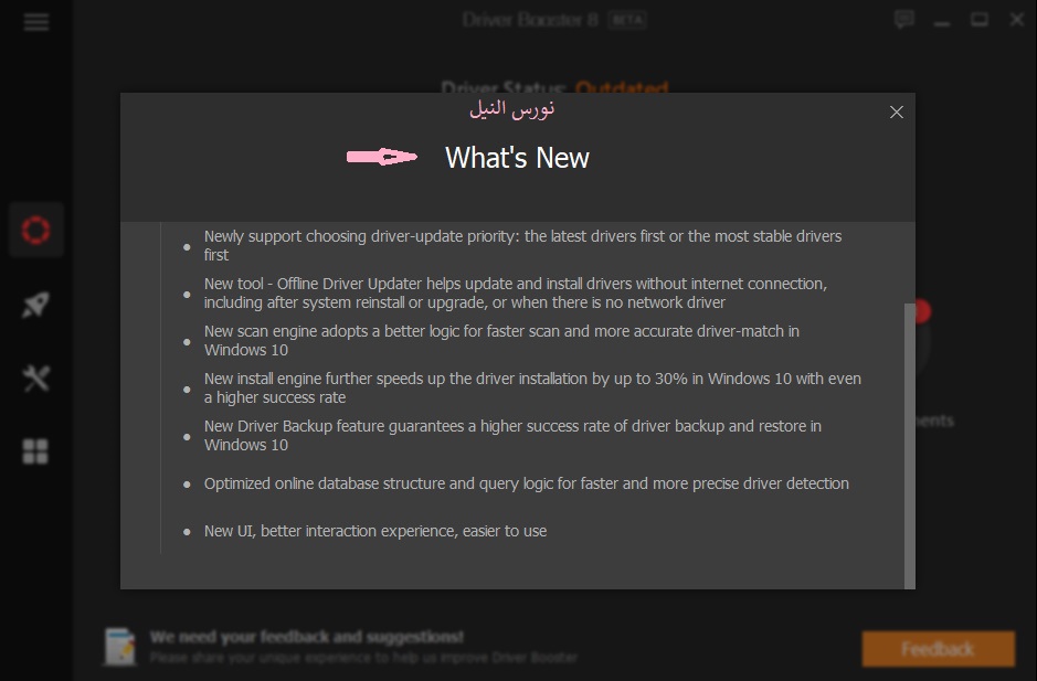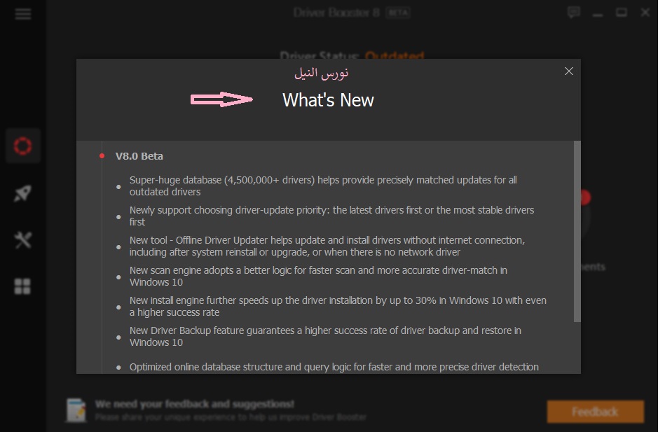 الأسرع و الأشهر في جلب التعريفات ( IObit.Driver.Booster.v8.0.0.92.Beta ) <div> بعد التحية و السلام على معاليكم صدرت نسخة حديثة تجريبية كاملة المزايا بتاريخ اليوم 19\7\2020 لملك برامج التعريفات لقطع الحاسوب https://www.arabsharing.com/do.php?img=240327 تم تحميلها و تجريبها و رفعها للأخوة الافاضل للأستفادة منها الجديد في هذه النسخة ينبأ بمستقبل جميل لهذا البرنامج الرائع بحسب ترجمة جوجل https://www.arabsharing.com/do.php?img=240330 ما هو الإصدار الجديد 8.0 Beta ؟otz: تساعد قاعدة البيانات الضخمة (4،500،000 + درايفر) في توفير تحديثات متطابقة بدقة لجميع برامج التشغيل القديمة دعم جديد اختيار أولوية تحديث برنامج التشغيل أحدث برامج التشغيل أولاً أو برامج التشغيل الأكثر استقرارًا أولاً otz: أداة جديدة - يساعد برنامج Offline Driver Updater في تحديث برامج التشغيل وتثبيتها بدون اتصال بالانترنت بما في ذلك بعد إعادة تثبيت النظام أو ترقيته أو في حالة عدم وجود برنامج تشغيل للشبكة otz: https://www.arabsharing.com/do.php?img=240331 يعتمد محرك الفحص الجديد على منطق أفضل لإجراء مسح ضوئي أسرع ومطابقة أكثر دقة للنظام في Windows 10 يعمل محرك التثبيت الجديد على زيادة سرعة تثبيت برنامج التشغيل بنسبة تصل إلى 30٪ في نظام التشغيل Windows 10 بمعدل نجاح أعلى تضمن ميزة النسخ الاحتياطي لبرنامج التشغيل الجديدة معدل نجاح أعلى في النسخ الاحتياطي واستعادة برنامج التشغيل في Windows 10 هيكل قاعدة بيانات محسن عبر الإنترنت ومنطق استعلام لاكتشاف برنامج تشغيل أسرع وأكثر دقة واجهة مستخدم جديدة ، تجربة تفاعل أفضل ، أسهل في الاستخدام. و هذه هي خصائص البرنامج بالصور https://www.arabsharing.com/do.php?img=240326 https://www.arabsharing.com/do.php?img=240328 https://www.arabsharing.com/do.php?img=240333 الاضافات الحديثة هنا https://www.arabsharing.com/do.php?img=240329 اللغات التي يدعمها فقط لغة انجليزية https://www.arabsharing.com/do.php?img=240332 فحص الفيروسات https://www.arabsharing.com/do.php?img=240334 حجم الملف حوالي 28 ميجا بايت رابط التحميل على الميديا فاير رابط سريع و مباشر https://mrkzgulfup.com/uploads/159501884802861.jpg http://www.mediafire.com/file/f4o2mx....Beta.rar/file و على عرب شير https://www.arabsharing.com/do.php?id=240335 hh: و بالتوفيق للجميع |