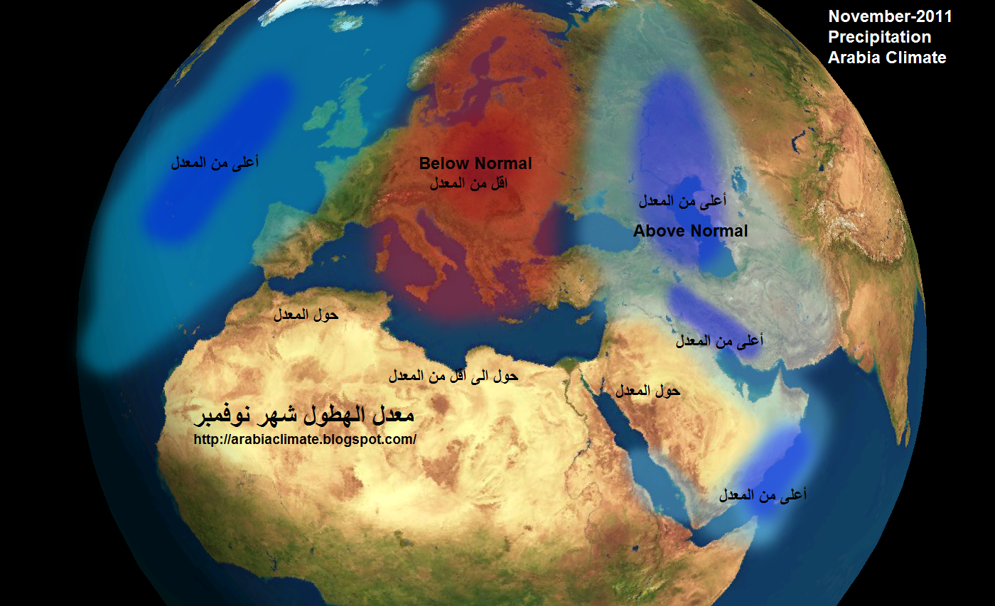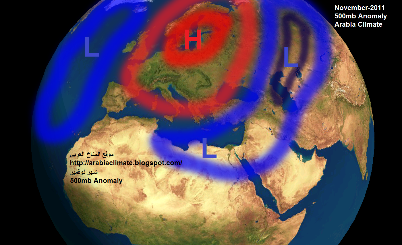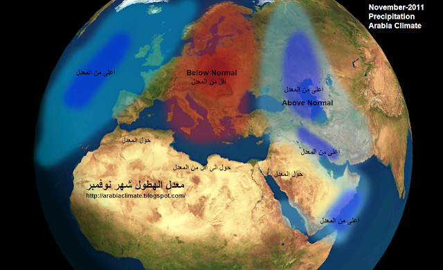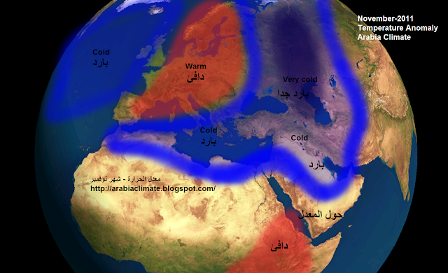 النشرة الموسمية التحديث الرئيسي الأول لموسم 2011-2012 لفترة (نوفمبر-ديسمبر-يناير) مقدمة : يتم إصدار نشرات جوية موسمية ذات نوعية خاصة في اصدارها واعتمادها على قيم معينة تختلف عن النشرات الجوية اليومية ، حيث تعتمد طريقة اصدار النشرة على سنوات التشابه، ويقوم موقع المناخ العربي منذ عام 2010 في اصدار هذه النشرات في فترتين احدهما في نهاية اكتوبر او بداية نوفمبر ، والاخرى في بداية فبراير ، وتكون لكامل المنطقة العربية والقارة الاوروبية ، وتحاز على دقة جيدة خلال التحديثات السابقة ، حيث حازت على دقة جيدة . وكما نعلم فهذه النشرات احتمالية ، وليست جزمية ، فنسبة الاخطاء متوقعة ، وسيتم اضافة خدمة جديدة لهذه النشرة حيث سيتم وضع درجة الثقة لكل شهر ، وكذلك بشكل عام للنشرة ، لان هذا سيخدم القارئ بشكل كبير . موسم 2011-2012 -الوضع العام - : ما يميز هذا الموسم هو الصعوبة الكاملة في عمل نشرة موسمية ، والسبب يعود الى قلة سنوات التشابه القريبة من الموسم القادم ، كذلك الى حركة الغلاف الجوي المضطربة والغريبة هذا في بداية هذا الموسم ، مما وفر صعوبة كبيرة في عمل النشرة الموسمية ، حيث تم البدء في النشرة الموسمية منذ 10 من اكتوبر ، وتم اصدارها في 5 نوفمبر ، اي انها احتاجت الى حوالي الشهر حتى تم اصدارها . الوضع المؤثر هذا الموسم هي حالة متوسطة من اللانينا ، وهي السبب الرئيسي في إرباك حركة الغلاف الجوي ، حيث سيميز هذا الموسم هو البرودة الشديدة وصعوبة التوقعات الجوية ، كذلك ما زالت درجات الحرارة الاعلى من معدلاتها تؤثر على المحيط الاطلسي حيث يتوقع ان تكون حرارة المياه حول معدلاتها الى اقل بقليل مع تقدم ايام الشتاء لاحقا ، وتتكدس المياه الدافئة غرب المحيط الهندي مما ساند في زيادة النشاط فوق مياه بحر العرب في الفترة الاخيرة،كذلك تتكدس مياه اكثر دفئا من معدلاتها العامة شمال غرب المحيط الهادئ والذي يلعب دورا كبيرا في اضطراب حركة الغلاف الجوي وانخفاض الحرارة ،وستسيطر المرحلة الايجابية من التذبذب الشمالي الاطلسي والتذبذب القطبي اغلب فترة هذا الموسم . توقع الموسم بشكل عام : الموسم بشكل عام سيكون باردا ، واحيانا وفي فترات الشتاء خاصة "باردا جدا " والاخص في مناطق المشرق العربي ، بينما تميل الاجواء في وسط والمغرب العربي الى درجات منخفضة وباردة الى حول معدلاتها العامة ، كذلك كيمات امطار حول الى اعلى من معدلاتها خلال الفترات القادمة . وتكون الامطار حول معدلاتها العامة الى اعلى بقليل على كامل اجزاء الوطن العربي هذا الموسم ، حيث توزعت في بداية الخريف خلال شهر اكتوبر "الذي تم اصدار رؤية خاصة فيه في موقع المناخ العربي " على دول المغرب العربي ، وستتمركز لاحقا خلال فصل الشتاء بشكل اكبر ناحية مشرق الوطن العربي . كذلك يتوقع ان تتمركز فرصة حدوث العواصف الثلجية على منطقة الوطن العربي وخاصة مشرقه خاصة في شهر يناير بإذن الله ، وكذلك تتزايد الفرصة كذلك فوق وسط المتوسط . ما سيميز هذا الموسم هو احتمالية عواصف قوية الى الشرق من القارة الاوروبية او على الاقل غرب القارة الاسيوية . ثقة النشرة : ثقة الشهر والنشرة هي خدمة جديدة تاتي مع النشرات الموسمية ، وهي توضح اذا كانت التوقعات ثقتها مرتفعة او منخفضة . النشرة الموسمية -2011-2012 لفترة (نوفمبر- ديسمبر -يناير) : شهر نوفمبر : مستوى 500 مللي بار : - تشير الخريطة اعلاه الى سيطرة قوية لمرتفع جوي وسط وشرق القارة الاوروبية ، مما يؤدي الى اندفاع واستمرار اندفاع تيارات باردة سيبيرية ناحية حوض شرق المتوسط وربما تطال وسطه في بعض الفترات خاصة منتصف الشهر الحالي . - ضغط منخفض شمال الاطلسي بشكل عام وفوق القبة القطبية ايضا . خرائط الهطول : - بشكل عام ستكون الهطولات حول معدلاتها العامة بإذن الله ، وقد تسجل اعلى بقليل على مناطق غرب البحر المتوسط . - حول الى اقل من المعدل في مناطق وسط المتوسط . - حول معدلاتها العامة في الجزيرة العربية الى اقل بقليل وحول معدلاتها في دول الشام ، واعلى بقليل كلما اتجهنا شرقا ناحية مناطق 