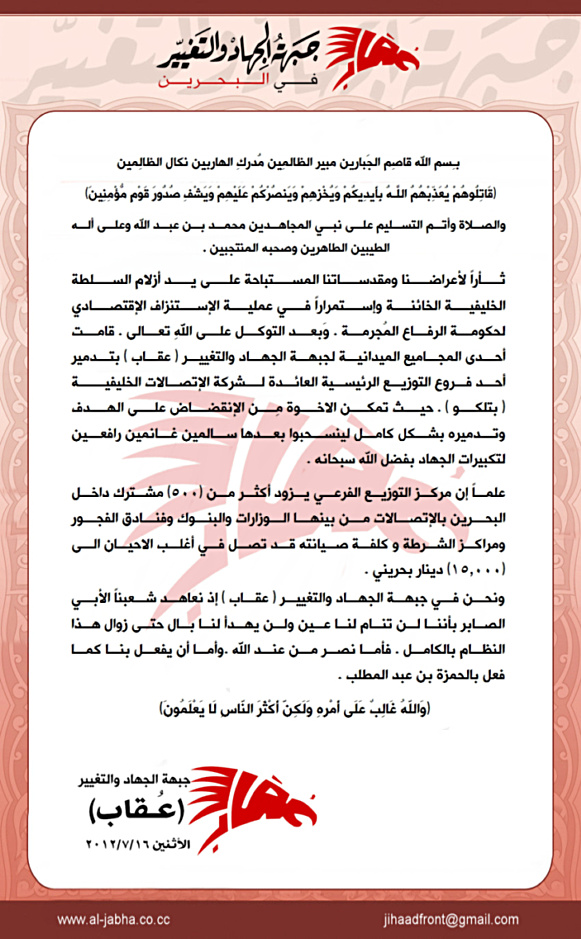 17/6 : عقاب تتبنى تدمير أحد فروع التوزيع الرئيسية التابعة لشركة بتلكو 7/16:: عقاب تتبنى تدمير أحد فروع التوزيع الرئيسية التابعة لشركة الإتصالات الخليفية (بتلكو) بيان العملية الجهادية http://1.bp.blogspot.com/-MN2GvzDOZr.../s1600/333.jpg صورة للهدف المُدمر وَهو يحترق http://1.bp.blogspot.com/-bVp057uKlI...0/s640/111.jpg جبهة الجهاد والتغيير ( عقاب ) http://www.al-jabha.co.cc/ [email protected] |