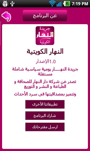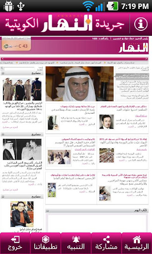 تطبيق جريدة النهار الكويتية اليومية المستقة للهواتف الاندرويد معلومات عن التطبيق جريدة النهـــــار يومية سياسية شاملة مستقلة تصدرعن شركة دار النهار للصحافة و الطباعة و النشر و التوزيع وتتميز بمصداقيتها فى سرد الأحداث عن باقيتها من الجرائد ولذلك انتشرت على مدى واسع صور من التطبيق https://lh6.ggpht.com/Ng1Qfwv4WhncGc...o17VQP2PM=w124 https://lh5.ggpht.com/Kh--1i8OtwqDKx...bEP5GqfjQ=w705 https://lh4.ggpht.com/KEpH3BR3GmCi3c...aV8RNACQUsD-HU https://lh5.ggpht.com/ZHKq7MxImA6vRE...jDGR62Vk6WXWgQ https://lh5.ggpht.com/1tBpVB5ornW__Q...tAjkQcCS4P0YV8 تحميل التطبيق من ماركت الاندرويد إضغط هنا https://play.google.com/store/apps/d...5haGFya3ciXQ.. |