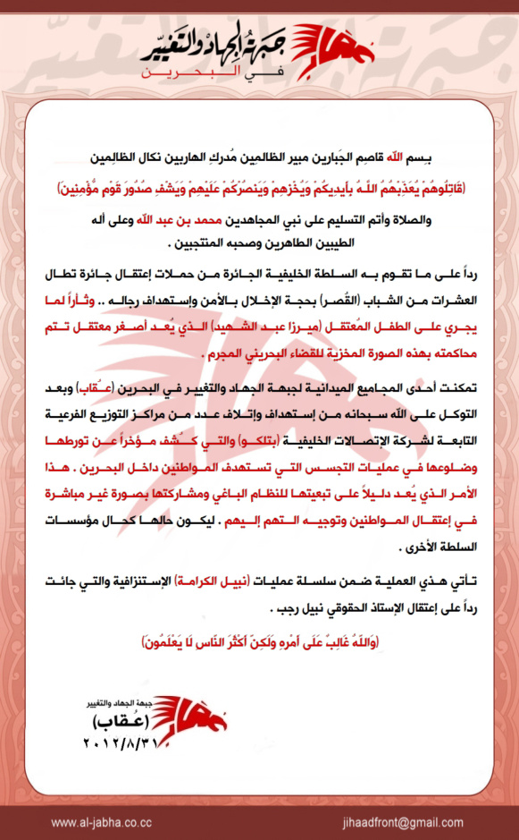 | عملية (نبيل الكرامة1)::عقاب تتبنى تدمير عدد من فروع شركة الإتصالات الخليفية ثأراً للمعتقل ميرزا عبد الشهيد ![]() بـِسم الله قاصِم الجَبارين مبيِر الظالمِيِن مُدرِكِ الهاربيِن نكال الظالِميِن (قَاتِلُوهُمْ يُعَذِّبْهُمُ اللَّـهُ بِأَيدِيكُمْ وَيُخْزِهِمْ وَيَنصُرْكُمْ عَلَيْهِمْ وَيَشْفِ صُدُورَ قَوْمٍ مُّؤْمِنِينَ) والصلاة وأتم التسليم على نبي المجاهدين محمد بن عبد الله وعلى أله الطيبين الطاهرين وصحبه المنتجبين . رداً على ما تقوم به السلطة الخليفية الجائرة من حملات إعتقال جائرة تطال العشرات من الشباب (القُصر) بحجة الإخلال بالأمن وإستهداف رجاله .. وثأراً لما يجري على الطفل المُعتقل (ميرزا عبد الشهيد) الذي يُعد أصغر معتقل تتم محاكمته بهذه الصورة المخزية للقضاء البحريني المجرم . تمكنت أحدى المجاميع الميدانية لجبهة الجهاد والتغيير في البحرين (عـُقاب) وبعد التوكل على الله سبحانه من إستهداف وإتلاف عدد من مراكز التوزيع الفرعية التابعة لشركة الإتصالات الخليفية (بتلكو) والتي كـُشف مؤخراً عن تورطها وضلوعها في عمليات التجسس التي تستهدف المواطنين داخل البحرين . هذا الأمر الذي يُعد دليلاً على تبعيتها للنظام الباغي ومشاركتها بصورة غير مباشرة في إعتقال المواطنين وتوجيه التهم إليهم . ليكون حالها كحال مؤسسات السلطة الأخرى . تأتي هذي العملية ضمن سلسلة عمليات (نبيل الكرامة) الإستنزافية والتي جائت رداً على إعتقال الإستاذ الحقوقي نبيل رجب . (وَاللَّهُ غَالِبٌ عَلَى أَمْرِهِ وَلَكِنَّ أَكْثَرَ النَّاسِ لَا يَعْلَمُونَ) جبهة الجهاد والتغيير (عقاب) 2012/8/31 http://www.al-jabha.co.cc ![]() ![]() |