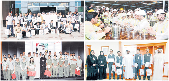 استمرار تكريم العمال والموظفين في مختلف المناطق واصلت الوزارات والدوائر الحكومية والفعاليات الرسمية والمؤسسات الاتحادية والمحلية في مختلف إمارات الدولة، الاستجابة لمبادرة “شكراً لكم” التي أطلقها صاحب السمو الشيخ محمد بن راشد آل مكتوم نائب رئيس الدولة رئيس مجلس الوزراء حاكم دبي، رعاه الله، بجعل احتفالات يوم الجلوس الخاصة بسموه، مناسبة للاحتفاء بفئات موظفي الخدمات الأساسية العامة كالمزارعين وعمال النظافة والبناء وسائقي المواصلات العامة وخدم المنازل وغيرهم . كرم صقر غباش وزير العمل العاملين في الموقع الإنشائي لمستشفى الجليلة بدبي . وأكد وزير العمل خلال زيارته للموقع الإنشائي أمس القيمة الإنسانية الرفيعة لمبادرة سموه الذي حرص على أن يكون الاحتفال بيوم الجلوس مخصصاً لهذه الفئات تكريماً لجهودها وعطائها في مختلف مواقع العمل . ووجه صقر غباش الشكر للعمال الذين عبروا عن سعادتهم الغامرة باللفتة الكريمة لصاحب السمو نائب رئيس الدولة رئيس مجلس الوزراء حاكم دبي رعاه الله . ووزع الهدايا التي قدمتها وزارة العمل وشركة الفطيم كاريليون التي تنفذ مشروع إنشاء مستشفى الجليلة . كما شارك وزير العمل العمال طعام الغداء في الموقع بحضور مبارك سعيد الظاهري وكيل الوزارة، وحميد بن ديماس السويدي الوكيل المساعد لشؤون العمل وماهر العوبد الوكيل المساعد لشؤون التفتيش، ويوسف عبد الغني الوكيل المساعد لشؤون السياسات والاستراتيجية، ومديري الإدارات وأكثر من 25 مفتشاً إلى جانب زهير الحاج مدير عام الموارد البشرية والشؤون الإدارية والتوطين بدول مجلس التعاون الخليجي لمجموعة الفطيم وسايمون ويب المدير التنفيذي للفطيم كارليون ورضا غانم مدير تطوير الأعمال في الشركة . وقال صقر غباش إن تعاون الوزارة ومجموعة الفطيم يمثل أحد أوجه الشراكة الاستراتيجية بين القطاعين الحكومي والخاص كما يؤكد حرص أصحاب العمل في الدولة على ترجمة مسؤوليتهم المجتمعية على أرض الواقع . وأثنى وزير العمل خلال تفقده للموقع الإنشائي على إجراءات الصحة والسلامة المهنية المتوافرة والتي تمثل تجسيداً عملياً لحرص أصحاب العمل في الدولة على توفير بيئة العمل الآمنة للعمال . قال زهير الحاج مدير عام الموارد البشرية والشؤون الإدارية والتوطين بدول مجلس التعاون الخليجي لمجموعة الفطيم حرصت المجموعة على توفير كافة مستلزمات العيش الكريم للعمالة التعاقدية المؤقتة وصون حقوقها ومستحقاتها بما في ذلك توفير بيئة العمل الآمنة وذلك انسجاماً مع توجيهات القيادة الرشيدة . ونظمت بلدية دبي لمستخدميها من فئة عمال النظافة وعمال الزراعة زيارة خاصة لهم في مواقع العمل المختلفة بإمارة دبي، حيث تم توجيه الشكر لهم على جهودهم ودورهم ومساهمتهم في المحافظة على نظافة مدينة دبي التي تعتبر من أنظف المدن العالمية بشهادة الجميع وهذا يدل على المجهود والإخلاص في العمل من هذه الفئة التي تستحق التقدير كما ان لهم دورهم في تجميل مدينة دبي أيضاً من خلال أعمال البستنة والتشجير وزراعة الورود على مدار العام، وتقديراً لهذا الدور تم توزيع مجموعة من الهدايا العينية عليهم . وكرمت هيئة الطرق والمواصلات صباح أمس 25 من عمّال وعاملات النظافة التابعين لإدارة الخدمات الإدارية في قطاع خدمات الدعم الإداري المؤسسي بالهيئة . ![]() وقامت أحلام الفيل، مديرة إدارة الخدمات الإدارية بقطاع خدمات الدعم الإداري المؤسسي، بتكريم العمال استناداً إلى عدد من المعايير . وكرم بهاء الدين القدرة مدير إدارة النقل البحري بمؤسسة المواصلات العامة في الهيئة (3) من سائقي الباص المائي و(2) من مساعدي السائقين وذلك في محطة السيف للنقل البحري . وقامت دائرة حكومة دبي الإلكترونية بتكريم موظفي الخدمات الأساسية العامة لديها، بمقرّها في ديوان سمو الحاكم بدبي، تقديراً لجهودهم وتفانيهم في تأدية أعمالهم . وقام أحمد بن حميدان مدير عام الدائرة بتسليم الموظفين المكرّمين شهادات تقدير وهدايا تذكارية بهذه المناس