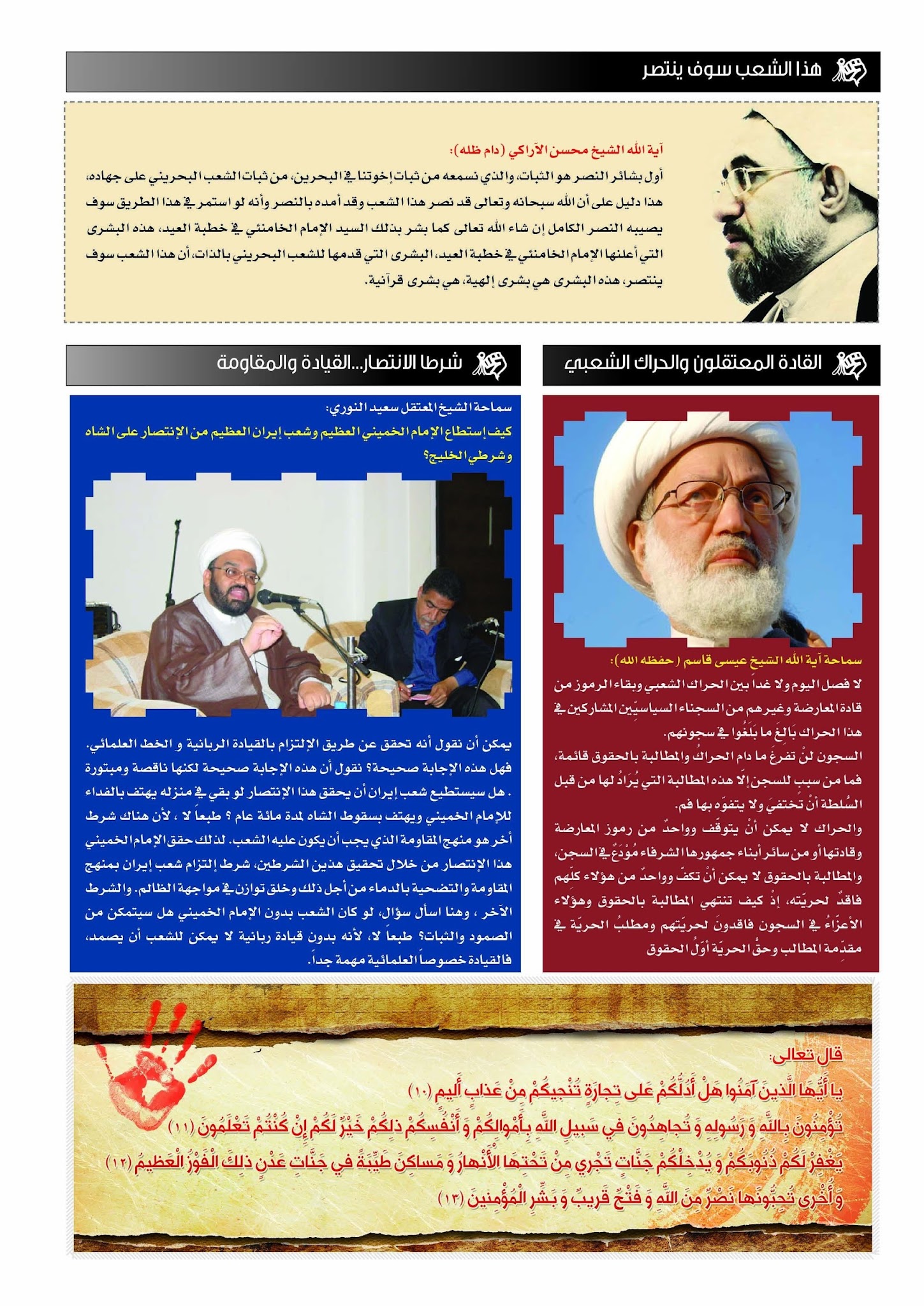 Thawra Media :: الإعلام الثوري نشرة الثورة :: العدد 39. الصفحة الاولى: - الامام الخامنئي: الحكومة الاسلامية. - الشيخ فاضل النكراني: الهزيمة الحتمية للظلام. الصفحة الثانية: - الشيخ محسن الأراكي: هذا الشعب سوف ينتصر. - الشيخ عيسى قاسم: القادة المعتقلون والحراك الشعبي. - الشيخ سعيد النوري: شرائط الانتصار... القيادة والمقاومة. الصفحة الثالثة: - الثورة ضرورة بغض النظر عن النصر العاجل. الصفحة الرابعة: - بيان ثبات القادة و الرموز. لتحميل النشرة: 4shared: من هنا |