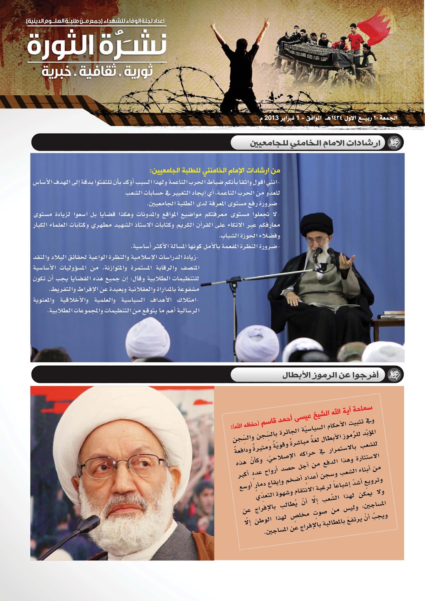 Thawra Media :: الإعلام الثوري نشرة الثورة :: العدد 40. الصفحة الاولى: - ارشادات الامام الخامنئي للجامعين. - الشيخ عيسى قاسم: افرجوا عن الرموز الأبطال. الصفحة الثانية: - الامام الخميني: العلماء والتلاميذ انتفضوا لهدف واحد. - الشيخ محسن الأركي: بدأ السوس يأكل السلطة. الصفحة الثالثة: - منطق النفعيين لحظة المواجهة. الصفحة الرابعة: - الأستاذ عبدالوهاب: الطلاب والعمل السياسي. - من أهداف لجنة الوفاء للشهداء. - الدكتور عبد الجليل السنكيس أمام القاضي: ارتفاع سقف المطالب. لتحميل النشرة: 4shared: http://bit.ly/WHEFaj ساهم بنشر الفكر الثوري الأصيل. __DEFINE_LIKE_SHARE__ |