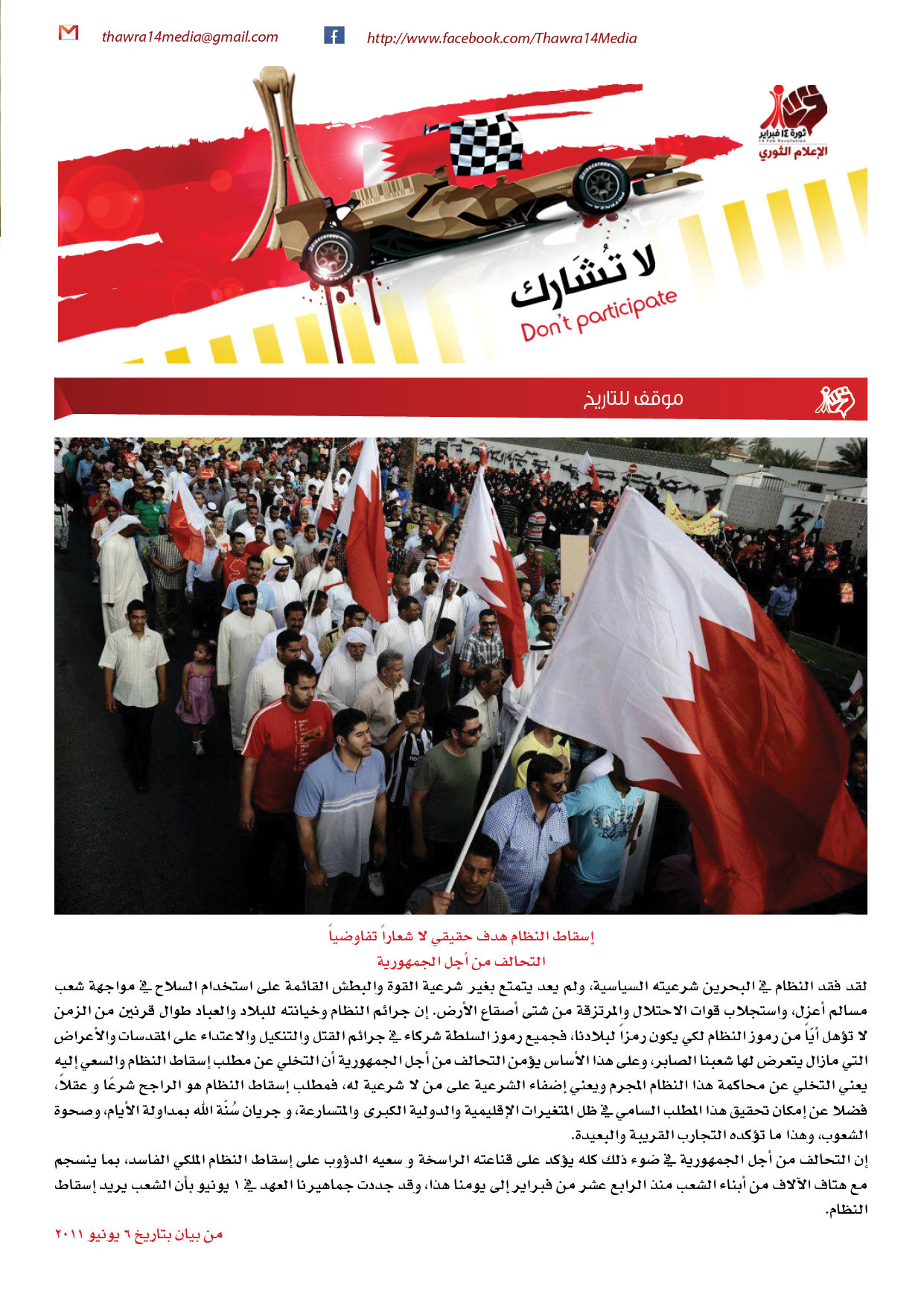 الصفحة الاولى: - وصية روح الله للشعوب الإسلامية. - الشيخ عبدالجليل المقداد: وظيفتنا الثبات. http://bit.ly/11VXdaO ![]() الصفحة الثانية: - الشيخ ناصر مكارم الشيرازي: ضريبة الفرار من الحق. - الامام الخميني: فاطمة الزهراء كلمة الله. http://bit.ly/X0SgNu ![]() الصفحة الثالثة: - التحالف من أجل الجمهورية: اسقاط النظام هدف حقيقي لا شعاراً تفاوضياً. http://bit.ly/11VYPS3 ![]() الصفحة الرابعة: - الدكتور عبدالجليل السنكيس: نعمل بالتكليف و النصر من الله. - مسائل فقهية من كتاب تحرير الوسيلة. http://bit.ly/11VZgeU ![]() لتحميل النشرة: 4shared: http://bit.ly/YO1zhu ساهم بنشر الفكر الثوري الأصيل وأرسلها |