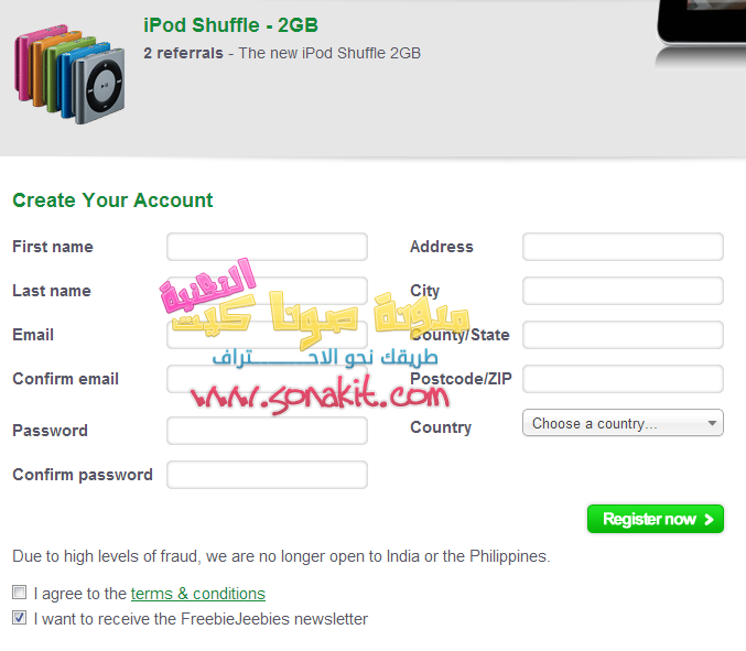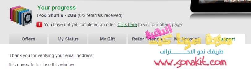 اليوم ومع شرح جديد الى كل متتبعي مدونة صوناكيت التنقية اليوم سوف أطرح لكم كيفية أحصل على Iphone 5 , Ipad , Ipod ,MacBook مجانا يصلك الى البيت ![]() اول شيء ندخل على هذا الموقع : اضغط هنا هده واجهة الموقع نختار الهدية التي نريد بعد الاختيار نضغط على Get This Free الا نقوم بملء البيانات بعد التسجيل سوف تصلنا رسالة لتاكيد الطلب بعد الضغط على رابط التفعيل سوف يتم تحويلك مباشر على الموقع يخبرك انه تم التأكيد بنجاح الان نضغط على Refer Friends سوف يعطينى رابط نقوم لاساله لشخصين او أكثر http://apple.freebiejeebies.co.uk/1008937 المهم الموقع يطلب منك جلب شخصين بعد تسجيلهما سوف يتم ارسال الهدية لك إن شاء الله مدونة صوناكيت التقنيه |