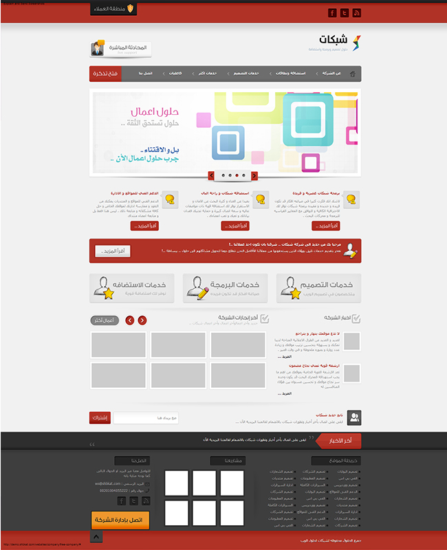 تسعد شركة شبكات للبرمجة و التصميم و الاستضافة ان تقدم لكم ثاني اعمالها المجانية وهو تصميم شركة تجارية مجاني بالكامل صالح للعديد من الانشطة مثل شركات الاستضافة و التصميم و البرمجة و المقاولات و المواقع التعريفية و المواقع الشخصية ايضا و معارض الاعمال . محتويات العمل يحتوي العمل علي الكثير من المميزات التالية عارض للصور (سيلايدر ) لعرض الخدمات و المنتجات و جديد العروض منطقة تسجيل دخول للعملاء منسدله من اعلى الصفحه بطريقة ظاهره و صديقه للمستخدم قوائم منسدله سلسة و سهلة التعديل بنرات دعائية لاهم الخدمات و المميزات عارض لاخر الاعمال و الانجازات او المشاريع الخاصة بالشركه على هيئة سيلايدر ايضا منطقة مميزه لعرض بيانات التوصل و ايقونات التواصل الاجتماعي صفحات العمل الصفحة الرئيسية صفحة خطط الاستضافه صفحة اعمال الشركة صفحة اتصل بنا صفحة خالية ليتم من خلالها انشاء اي صفحة اخري صورة للصفحة الرئيسية الخاصة بالعمل ![]() مشاهدة مباشرة للعمل - الصفحة الرئيسية - صفحة خطط الاستضافه - صفحة اعمال الشركة - صفحة اتصل بنا - صفحة خالية ليتم من خلالها انشاء اي صفحة اخري تحميل العمل لتحميل ملفات العمل بملف مضغوط اضغط هنا طريقة التركيب عدل ما يلزم من النصوص ثم ارفع الملفات داخل مجلد www ثم قم بالتجربه الان بسهوله ![]() ملحوظة هامة جميع صفحات الموقع بها روابط وتكست الخاص بشركة شبكات تستطيع تغييره وبكل سهولة عن طريق اي محرر هل لنا أن نساعدك؟ للمحادثة الفورية مع ممثلى خدمة العملاء المحادثة المباشرة | شركة شبكات في خدمه عملاء الشركة http://cs.shbkat.com قاعدة المعرفة قاعدة المعرفة - منطقة عملاء شبكات ..:: للاطلاع على اخر اعمال شركة شبكات اضغط هنا ::.. في النهاية نتمنى ان نكون قد وفقنا في تقديم هذا العمل المجاني .. راجين من الله لكم التوفيق دائما ابدا و ان يكون العمل عند حسن ظنكم ان شاء الله . نترك لكم حرية حذف حقوق شبكات بالكامل ولانسمح اخيرا ان يتم استخدام العمل تجاريا او نسب حقوق التصميم لاية جهه او فرد دون الرجوع لنا .انتظرونا قريبا بتصميم مجاني لقالب whmcs لشركات الاستضافة و التصميم و البرمجة . |