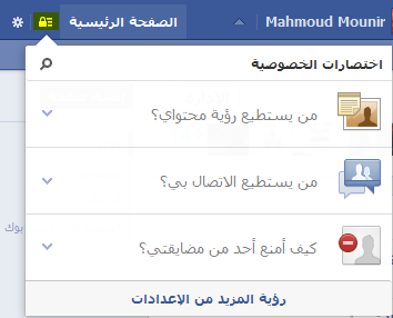 ![]() الان سوف نقوم بشرح الخصوصية في الفيس بوك بالشكل الجديد 2013 ، ولكن الشكل الجديد يتيح اختصارات الخصوصية ، فسوف نقوم بشرح من يستطيع ارسال رسائل لك وايضاً من يمكنه ارسال طلبات صداقة لك ، فاصبح الوصول اليها وتغييرها سهل للغاية. اختصارات الخصوصية تندرج تحت علامة القفل الجديدة بجوار "الصفحة الرئيسية" اعلي الفيس بوك ، ويندرج منها ثلاث خيارات وهي :-