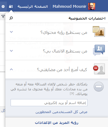 ![]() 1 - من يستطيع رؤية محتواي؟ من يستطيع رؤية محتواي؟ ، ويندرج منها "من يستطيع رؤية منشوراتي المقبلة؟" وهنا تختار من تريد ان يري منشوراتك القادمة ، ان اخترت العامة ستظهر منشوراتك القادمة للجميع وان اخترت الاصدقاء ستظهر للاصدقاء فقط ، وهناك تذكير بالاسفل باني قمت بتغيير هذا الاعداد مضمنة عندما قمت بنشر وهذا بسبب اني اقوم بنشر منشورات للعامة ومنشورات للاصدقاء فقط. ![]() 2 - من يستطيع الاتصال بي؟ من يستطيع الاتصال بي؟ ، وهناك اختيارين وهما من يستطيع ارسال رسائل لي ومن يستطيع ارسال طلبات صداقة لي ، وفي طلبات الصداقة تقوم باختيار اما العامة او اصدقاء الاصدقاء. واما عن ارسال الرسائل فتقوم باختيار اما "تصفية اساسية" وهنا تتلقي رسائل من الاصدقاء ورسائل من العامة ، او "تصفية صارمة" وهنا تتلقي من الاصدقاء فقط. ![]() 3 - كيف امنع احد من مضايقتي؟ كيف امنع احد من مضايقتي؟ ، وهنا تقوم بحظر شخص يضايقك او تريد تجاهلة تماماً ، فقط تقوم بكتابة اسمة او بريدة الالكتروني ثم تقوم بالضغط علي حظر. ![]() وهذه كانت اعدادات الخصوصية الجديدة للفيس بوك 2013 ، ويمكنك الضغط علي "رؤية المزيد من الاعدادات"وسوف تظهر لك اعدادات اخري كمن يستطيع البحث عني وغيرها. ![]() |