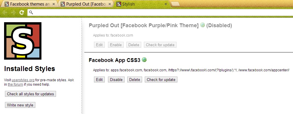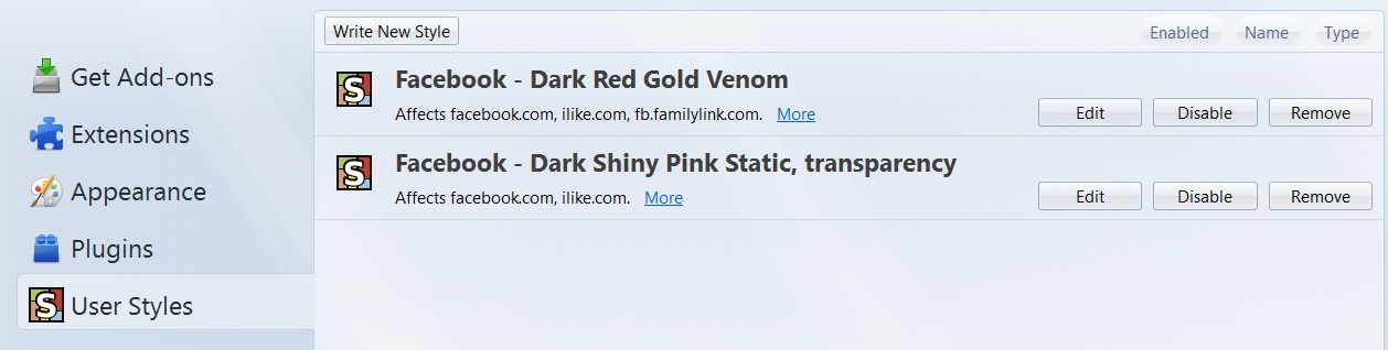 والان قد اخترنا لكم الاشكال بالاسفل والتي تم انتقاءها من بين التصميمات علي الموقع وبالفعل هي رائعة وفي غاية الجمال ولكن لم نتمكن من عرض كل الاشكال الرائعة علي الصفحة ، لذلك فقط سنقوم باستعراض 10 ثيمات واذا اردت المزيد فالصفحة ممتلئة بالاشكال الاخري الرائعة. 1 - شكل Purpled Out ![]() 2 - شكل Dark Shiny Pink Static ![]() 3 - شكل Blacked Out ![]() 4 - شكل Perfect facebook theme ![]() 5 - شكل Blacked Out ![]() 6 - شكل App Facebook ![]() 7 - شكل Pink ![]() 8 - شكل Hardback Book & Ribbon ![]() 9 - شكل iPad Series: Page Flip ![]() 10 - شكل Green Facebook ![]() التحكم في الثيمات المثبته لكي تقوم بتثبيت ثيم يجب عليك تعطيل الاخر وهنا نأتي الي ادارة الثيمات لديك ، والامر سهل للغاية فبالنسبة لجوجل كروم يمكنك ادارتها من خلال ايقونة Stylish علي الشريط بالاعلي ثم الضغط علي Manage installed styles ، ثم التحكم فيها. ![]() اما بالنسبة لفايرفوكس فتقوم بالضغط علي Tools ثم Add-ons ثم User Styles ثم تقوم بالتحكم في الاشكال من خلال الضغط علي Remove لحذف ما تريد والابقاء علي ما تريد. ![]() فكما تلاحظ الامر سهل ويمكنك التحكم بشكل كامل في الثيمات والعودة مرة اخري الي الثيم الافتراضي للفيس بوك ، فالامر لم يكن اسهل من ذلك. فيمكنك تعطيل ثيم مؤقتاً او حذفة بشكل كامل ، ويمكنك اعادة تفعيله مرة اخري. الخلاصة اذا اردت في اي وقت ازالة الاضافة فيمكنك ازالتها مثل اي اضافة سواء من الفايرفوكس او جوجل كروم ، من خلال Tools ثم Add-ons ثم تقوم بالضغط علي Disable او Uninstall لازالتها بسهولة ، كما يمكنك تعطيل جميع الثيمات كما ورد بالاعلي وبذلك يعود الفيس بوك لديك الي الشكل الرسمي. بالتأكيد الثيمات بالاعلي رائعة وجميلة وهناك المزيد وايضاً المزيد يتم اضافته يومياً فيمكنك اختيار ما تشاء منها والتبديل بينهم حتي لا تشعر بالملل من شكل واحد فقط طوال الوقت. اتمني أن يكون الموضوع مفيد والشرح واضح وشكراً لكم. ![]() |