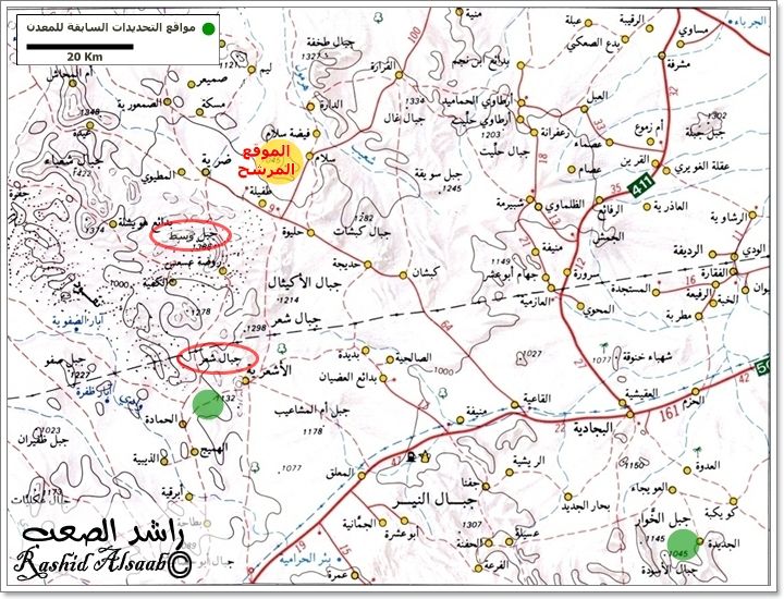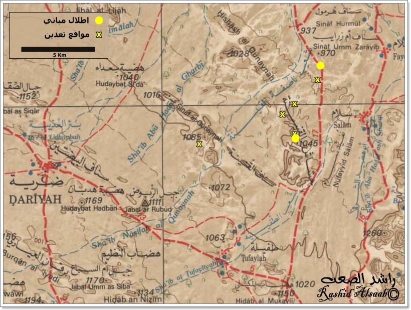 | بسم الله الرحمن الرحيم الحمد لله والصلاة والسلام على رسول الله صلى الله عليه وعلى آله وسلم، هذا هو الجزء الثاني من موضوع : تحقيق الاسم القديم للدوادمي. ******* رابط الجزء الأول ******* في هذا الجزء: - معدن الأحسن في ضرية - معدن الخوع ( 1 ) تحقيق مكان معدن الأحسن في ضرية تمهيد: يتشابه هذا المعدن في الاسم مع " الأحسن " المعدن الذي سبق تحقيقه، والمعدنان يختلفان في الموقع وفي نوع الجوهر، فمعدن " أحسن ضرية " يقع داخل الحمى وهو معدن فضة كما ذكر، ومعدن الأحسن بعيد عنه وهو معدن ذهب. الدراسات السابقة أ – الذين حَدَّدوا مكان المعدن وآرائهم : 1- الشيخ حمد الجاسر ( 1389 ) معلقاً على النص الذي ورد فيه ذكر المعدن ويرى : " وجبل وسط لا يزال معروفاً يشاهد من قرية ضرية جنوباً، أما الاحاسن فجبال تقع في الجنوب من ضرية بمسافة ".(1) 2- الشيخ سعد الجنيدل ( 1398 ) ويرى أن " الأحسن " اسم لمعدن واحد، حيث قال : " ما ذكره ياقوت عن النوفلي لم يقل به غيره، وجبل وسط لا يزال معروفاً يقع جنوب قرية ضرية، أما الأحسن فغير معروف، وتحديده عن النوفلي يخالف ما ذكره الأصفهاني في تحديد معدن الأحسن، وكذلك ما ذكره ياقوت قبله، إذ الأقوال متفقة على أن الأحسن في بلاد أبي بكر بن كلاب، وأنها في طريق اليمامة إلى ضرية، بين اليمامة وبين حمى ضرية، ولم يرد قول بأنها في الحمى إلا ما قاله النوفلي". (2) 3- الشيخ حمد الجاسر ( 1408 ) معلقاً على النص الذي ورد فيه ذكر المعدن ويرى : " يقع جبل الحسن ( الأحسن ) المشهور بمعدن الفضة قديماً في طرف جبل شعر من الجنوب". (3) ب - رشح الباحث جبال القنينة وآثارها التعدينية لتطبيق النص البلداني وفيما يلي الآراء السابقة في هذه الآثار: 1- الشيخ سعد الماضي ( 1429 هـ ) ويرى أنها آثار معدن عراقيب حيث قال : " كانت الإحداثية التي سجلتها عند وصولي إلى المكان هي : 28 ً (0.483) 46 َ 24 ْ ش 52 ً (0.885) 05 َ 43 ْ ق .... ثم إنه أخذ البحث بلُبِّي فصرت أقلـّب بصري ذات اليمين وذات الشِّمال حتى قادني حب البحث إلى آثار أخرى بين جبلين حيث كانت شقوق التعدين ماثلة للعيان عند : 58 ً (0.985) 43 َ 24 ْ ش 02 ً (0.017) 05 َ 43 ْ ق .... هنا رجعت بذاكرتي إلى ما كنت أريد أن أبحث عنه وهو معدن عراقيب ". (4) ![]() خريطة توضح الدراسات السابقة ******* النصوص التي ورد فيها ذكر المعدن والتعليق عليها نص واحد فقط قال الحربي: " أخبرني أبن أبي سعيد عن أبيه قال : ضرية بلد قديم، وقرية عامرة، على طول الدهر، فيها جبلان يشرفان عليها، أحدهما عن يمين المصعد يقال له وسط، ....والجبل الآخر عن يسار المصعد، يقال له الأحسن، وبه معدن الفضة".(1) التعليق 1- في قوله عن الجبلين " يشرفان عليها " تحديد بأن الجبل الذي فيه المعدن قريب من البلدة. 2- قوله عن الجبل " عن يسار المصعد " تحديد بأن المعدن يقع جهة الجنوب أو الشرق عن بلدة ضرية. 3- هذا التحديد ينطبق على جبل يسمى اليوم " القنينة " يقع شرق ضرية غير بعيد عنها، وفيه آثار تعدين، ولا يوجد في تلك الناحية من ضرية غير هذه الآثار. ![]() خريطة تبين موقع المعدن * ** * ![]() جبل القنينة ( جبل الأحسن ) * ** * ![]() الطرف الجنوبي من جبل وسط ******* أطلال قرية المعدن تتكون قرية المعدن من حيين شمالي وجنوبي أولا الحي الجنوبي ويقع في وسط الجبل عند شقوق التعدين ويبدو انه مخصص لعمال المعدن ![]() المكان الذي يقع فيه الحي الجنوبي * ** * ![]() أضخم المنشآت في الموقع * ** * ![]() + ![]() + ![]() + ![]() + يتبع |