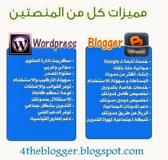 بسم الله الرحمن الرحيم لمن لايعرف مايختار بين منصة بلوجر ومنصة الوورد بريس لايحتار بعد اليوم لان اليوم جايبلكم صورة توضحية لفرق بين المنصتين بلوجر و وورد بريس http://2.bp.blogspot.com/-s5mqvYgiUH...fA/s1600/w.JPG المصدر:مالفرق بين منصة Blogger ومنصة WordPress __DEFINE_LIKE_SHARE__ |