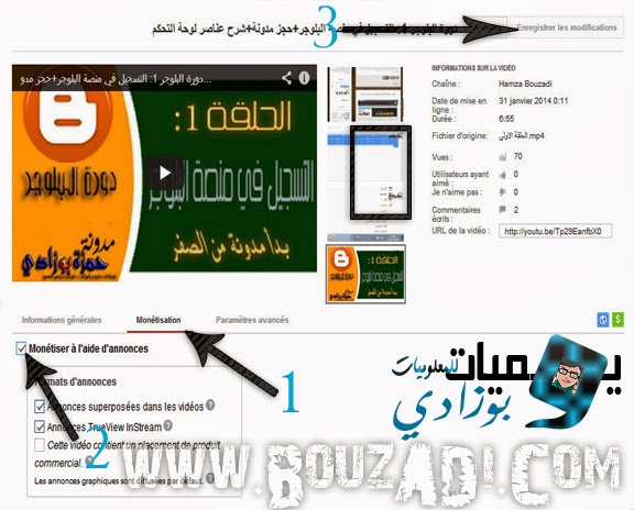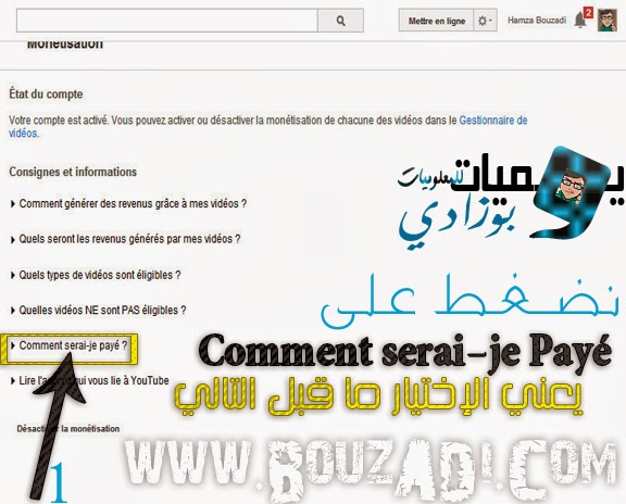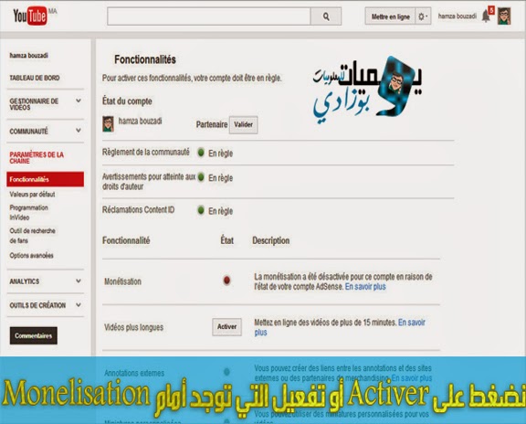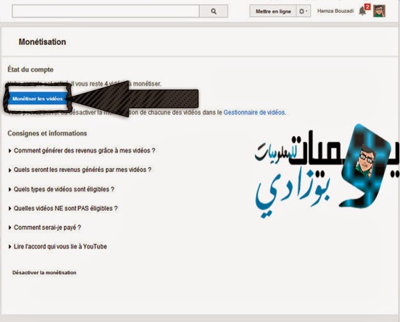 [IMG][/IMG] - و بعدها تحمل الفيديو و تنتظر حتى يتم تحميله الخطوة الثانية و هي تفعيل إعلانات أدسنس على الفيديو المرفوع : نتوجه إلى هذا الرابط https://www.youtube.com/features و نتبع الصورة التي [IMG][/IMG] -أنا شخصيا فعلتها من قبل إذن لن تظهر لي الخطوة الثالثة و هي مهمة لوضع الإعلانات على الفيديوهات و في نفس الوقت ربط قناتك مع حسابك أدسنس أوتوماتيميا نتوجه إلى هذا الرابط https://www.youtube.com/account_monetization بعدها نضغط على Monaliser Les Video كالموضح في الصورة [IMG][/IMG]
