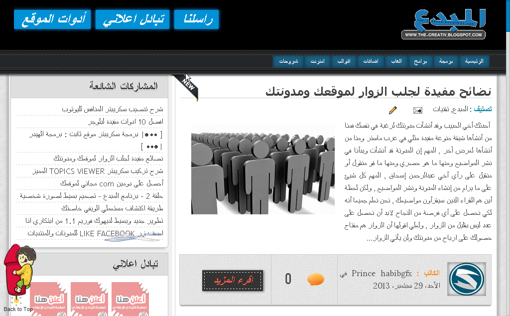| السلام عليكم اهلا وسهلا بكم اخواني الكرام بعد مدة طويلة من العمل احضرت لكم اليوم قالب جديد معرب ومطور من طرفي تحت اسم قالب المبدع الاصدار الرابع قمت بالعمل على تعديله وجعله متناسق مع المتصفحات لعدة ايام مع الحفاظ على حقوق لمصمم القالب بالاضافة الى اضافة حقوقي للتعديل والتطوير اترككم مع المعاينة المباشرة اضغط هنا تحميل القالب بالمرفقات صورة للقالب جميع الحقوق محفوظة لمدونة المبدع ![]() الملفات المرفقة the-creativ-v4.zip (27.7 كيلوبايت)