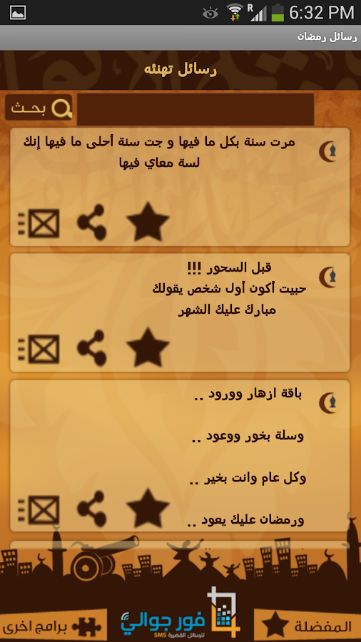 ![]() كل عام وانتم بخير بمناسبة حلول شهر رمضان المبارك هذه مجموعة برامج للاندرويد بمناسبة هذا الشهر المباركأرجو ان تنال اعجابكمولا تنسوني بصالح الدعاء 1 برنامج يومك في رمضان ![]() هذا البرنامج مقترح يمكن تعديله حسب ظروف كل شخص. البرنامج يحدثنا عن المسلم الصائم في رمضان، وما ينبغي أن يحرص عليه حال صيامه - لو فات شيء مهم في مرحلة من المراحل حاول قضاؤه في مرحلة أخرى. - انتبه للفراغات البينية أثناء اليوم بين عمل وآخر مثل وقت المواصلات وانتظار عبادة (الفراغ بين الأذان والإقامة) واقضه فيما ينفع كقراءة القرآن وذكر الله تعالى. - مشاركة إخوانك وأصدقائك وأهلك في البرنامج للتشجيع وعدم الفتور. - إصلاح ذات البين ![]() ![]() يحتوي البرنامج على المزايا التالية: 1- التاريخ الهجري مع توضيح منازل القمر بصورتها واسمها 2- مواقيت الصلاة بقاعدة بيانات ضخمة تضم عدد كبير من البلاد (من برنامج طمأنينة مفتوح المصدر) 3- يمكنك معرفة الوقت المتبقي على الصلاة القادمة 4- بإمكانك أن تعرف المدة المتبقية على موعد الإفطار وصلاة المغرب. 5- مع إمكانية تحويل الهاتف إلى ضع صمت بعد الأذان 5- كل ما يهم المؤمن من موضوعات متعلقة برمضان مثل أحكام الصوم وأذكار الصباح والمساء وكذلك كل ما يتعلق بليلة القدر 6- جزء هام يضم فتاوى الصيام الصادرة عن دار الإفتاء المصرية 7- المعلومات الواردة في البرنامج من مصادر متعددة لأهل السنة والجماعة.. ومواقع دار الإفتاء المصرية وكتاب الصيام الصادر عنها وكذلك كتاب الصيام في الإسلام للدكتور سعيد بن علي بن وهف القحطاني الإمساكية ، الامساكية الامساكيه ![]() ![]() 3 برنامج رسائل رمضان تقدم لكم فورجوالي برنامج تهاني رمضان والرسائل الدعويه خلال الشهر الفضيل اكثر من 300 رساله جاهزه يمكنك الاختيار من بينها والتواصل مع اصدقائك يمكنك من خلال البرنامج ارسال الرسائل عن طريق - ارسال من خلال الواتس اب - ارسال من خلال الفيس بوك - ارسال من خلال الرسائل النصيه - ارسال من خلال البريد الالكتروني البرنامج مقسم الي : - رسائل تهنئه بقدوم رمضان- رسائل دعوية في رمضان ![]() ![]() 4 خلفيات رمضانية ![]() ![]() 5 أدعية رمضان حمل تطبيق ادعية رمضان واستمع الي افضل الادعيه الرمضانيه بصوت أشهر قراء الوطن العربي ويمكنك تحميل هذه الادعيه علي جهازك حتي تسطيع سماعها في اي وقت وفي اي مكان يضم التطبيق مجموعة قيمة من الأدعية والأذكار بصوت أشهر القراء في الوطن العربي مثل : - الشيخ مشاري العفاسي - الشيخ ماهر المعيقلي - الشيخ محمد جبريل - الشيخ سعود الشريم - الشيخ ياسر الدوسري - الشيخ يوسف القرضاوي ![]() 6 اناشيد ورنات رمضانية أناشيد رمضانية - اناشيد ورنات رمضانية - رمضاناناشيد ورنات رمضانيةيضم التطبيق مجموعة رائعة من الأناشيد الرمضانية والرنات الرمضانية بأعذب الأصوات وأشهر المنشدين: مشاري راشد العفاسي، عمر العمير، مشاري العرادة , ماهر زين , سامي يوسف , سمير البشيري, أبو علي , ابو عبدالملك , عماد رامي , zain bhikha , سعد الطلحة وغيرهم من الأصوات الجميلة---------------------------------- إمكانية تحميل اي أنشودة على الجهاز والاستماع لها بدون الاتصال بالانترنت.امكانية اضافة اي أنشودة الى قائمة المفضلة للوصول لها بشكل سريع في اي وقت باستخدام زر القائمة.ثم متابعة الأنشودة بعد الانتهاء من المكالمة--------------- ![]() ![]() 7فتاوى رمضان فتاوى رمضان تطبيق يقدم إجابات على أهم أسئلة الصائم و أكثرها شيوعا: ما حكم من مس يد فتاة في نهار رمضان ؟حكم إحتلام الصائمكفارة الاستمناء في نهار رمضانمفسدات الصيامأشياء لا تفطرما هو الدعاء المأثور عن النبي صلى الله عليه وسلم عند الإفطار وعند السحور؟ما حكم من أكل أو شرب في نهار الصيام ناسيا؟ما حكم بقايا الطعام في الفم، وفتات السواك، ودم اللثة؟ ![]() ![]() 8 مسابقة رمضان سم الله والصلاة والسلام على رسول الله... نقدم لكم مسابقة القران الكريم< مجموعة كبيرة من الأسئلة المتعلقة بالقرآن الكريم سوره واياته ،اسئلة مشوقة تعرض بأسلوب المسابقات الممتع ،في حال عدم معرفة الاجابة 