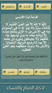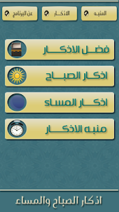 | برنامج اذكار لاذكار الصباح والمساء فيه جميع الاذكار الصباحية والمسائية مقروءه ومسموعة كما يمكنك مشاركة الاخرين بالاذكار عبر برامج التواصل ويوجد منبه لتذكيرك بوقت الاذكار https://play.google.com/store/apps/details?id=com.zahran.athkar |