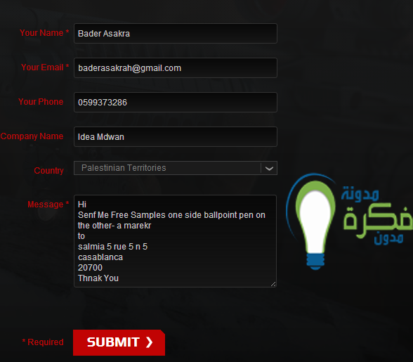 بسم الله الرحمن الرحيم متابعي مدونة فكرة مدون والصلاة والسلام على خير خلق الله سيدنا محمد عليه أفضل الصلاة واتم التسليم السلام عليكم ورحمة الله وبركاته . أحصل على كاتولج وقلمين مجاناً لباب منزلك والهدايا عبارة عن " كاتولج جميل عن الأسلحة + قلمين جميلين " : صورة للهديا ![]() الشرح : ملاحظة : الرجاء منكم إنشاء إميل فقط للمجانيات لاني سوف ابدأ بعمل دروس كثيرة للمجانيات ومعضم المواقع المستخدمة يرسل رسالة تفعيل للبريد أولاً نقوم بالذهاب إلى هذا الموقع من هنا. ثانياً نقوم بكتابة هذه الرسالة في ال " Message" Hi