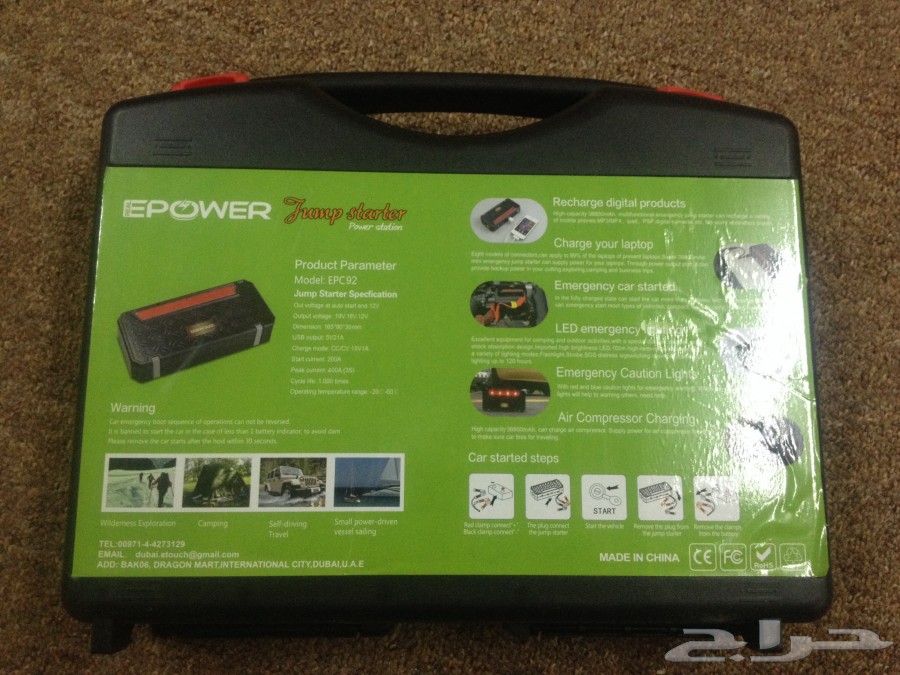السلام عليكم ورحمة الله وبركاته شاحن متنقل اللون اسود الصناعه صينيه درجة اولى النوع EPOWER القوه 38800 امبير المميزات 1- يقوم بشحن بطارية السياره في حال تعطلها 2- يشحن الجوالات واللابتوبات ويقوم بتشغيل جميع الاجهزه الاكترونيه اللي تعمل بنظام الفولت وليس الوات 3- الجهاز يعطي 12 فولت و16 فولت و19 فولت 4- يوجد بالجهاز لمبة ليد بثلاث اللوان (الاحمر'الازرق 'الابيض) الاحمر والازرق فلاشات والابيض 5- يوجد بالجهاز منفذ usb 6- تستطيع ان تقوم بتشغيل اللمبه الليد حقت الرحلات بدون بطارية السياره الجهاز نفسه يشغلها 7- معه ماطور هوا 8- شنطه بلاستيك حافضه للاجهزه انيقه جدا السعر 370 ريال خارج الرياض التوصيل عن طريق زاجل او البريد للتواصل 0508966111 ![]() ![]() ![]() ![]() ![]() ![]() ![]() ![]() ![]() ![]() |