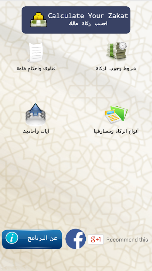 | احسب الزكاة zakat calculator https://play.google.com/store/apps/d...aqa.zakat_alms يـتـميـز هذا البرنامج بسهولة حساب زكاة المال ,فقط ضع الملبغ النقدي و اختر بلدك. ويقوم البرنامج تلقائيا بحساب النصاب في بلدك (بعد اختيار العملة, يظهر في الشاشه :سعر غرام الذهب عيار 24 في بلدك) Easy-to-use zakat calculator Nisab is calculated for you using up-to-date gold rates Guidance information on zakat in general Calculate Your Zakat Using the Latest Nisab Values. This program features easily calculate the zakaah ( alms ) on wealth, where all you need is put how much of your cash and choose the currency of account Zakat (country) The program automatically calculates the nisaab in the country (after selecting currency, appears in the screen: The price of gram of 24 carat gold in your country). niṣāb (نِصاب) is the minimum amount for a muslim net worth to be obligated to give zakat. The price of gold is updated each time you enter the program (requires Internet connection, or you can put it manually if you can not connect) "Take Zakah from their wealth to purify and cleanse them" - Surah at-Tawba "By giving Zakat the inner soul of the payer becomes enriched, and his wealth becomes cleansed." - Ibn Taymiyyah Zakat is not a simple tax; it is an act of worship which may be described as financial worship. The easiest and most reliable zakat application. https://play.google.com/store/apps/d...aqa.zakat_alms |