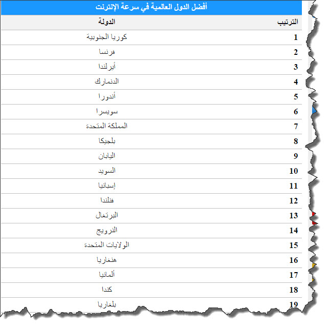 كشف الاتحاد الدولي للاتصالات "ITU" في تقريره الأخير لسنة 2015 عن تصدر "كوريا الجنوبية" في سرعة الإنترنت تليها "فرنسا" في المرتبة الثانية. ووفقاً للتقرير فإن عدد مستخدمي الإنترنت على الصعيد العالمي يصل إلى 3.2 مليار شخص يعيش ملياران منهم في البلدان النامية. وجاءت الإمارات العربية المتحدة في المرتبة الـ35 عالمياً والأولى عربياً في سرعة الإنترنت تلتها "السعودية" في المرتبة الـ36. ![]() ![]() المــــصدر |