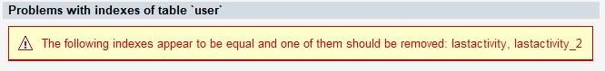 | Hi everyone ... In my database, I did a table check and I faced a note at the end tells me that " there are Problems with indexes of table `user`" check the photo ![]() If anyone can tell me what is the problem? Best regards __DEFINE_LIKE_SHARE__ |