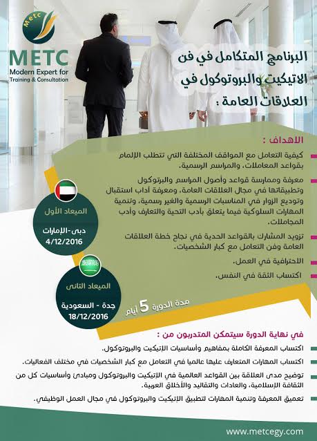 ![]() السلام عليكم ورحمه الله وبركاته يسعدنى ان اقدم لكم بأسم مركز الخبرة الحديثة للتدريب والاستشارات (metc) الدورات التدريبية في جميع المجالات ويدعوكم للتسجيل في دورة (البرنامج المتكامل في فن الاتيكيت والبروتوكول في العلاقات العامة) اهداف الدورة - كيفية التعامل مع المواقف المختلفة التي تتطلب الإلمام بقواعد المعاملات، والمراسم الرسمية - معرفة وممارسة قواعد وأصول المراسم والبرتوكول وتطبيقاتها في مجال العلاقات العامة، ومعرفة آداب استقبال وتوديع الزوار في المناسبات الرسمية والغير رسمية، وتنمية المهارات السلوكية فيما يتعلق بأدب التحية والتعارف وأدب المجاملات - تزويد المشارك بالقواعد الحدية في نجاح خطة العلاقات العامة وفن التعامل مع كبار الشخصيات - الاحترافية في العمل - اكتساب الثقة في النفس في نهاية الدورة سيتمكن المتدربون من : - اكتساب المعرفة الكاملة بمفاهيم وأساسيات كل من الإتيكيت والبروتوكول - اكتساب المشاركين المعرفة والمهارات اللازمة والمتعارف عليها عالميا في التعامل مع كبار الشخصيات والضيوف الرسميين وفي مختلف المناسبات والفعاليات والمحافل المحلية والدولية - تبسيط مفاهيم الإتيكيت والبروتوكول واستكشاف علاقتها العضوية بالسلوكيات الفردية اليومية. - توضيح مدى العلاقة بين القواعد العالمية في الإتيكيت والبروتوكول ومبادئ وأساسيات كل من الثقافة الإسلامية، والعادات والتقاليد والأخلاق العربية. - اكتساب المعرفة والمهارات اللازمة في تنظيم لقاءات التباحث والتفاوض، والاجتماعات الرسمية والاحتفالات الرسمية والعامة - تعميق المعرفة وتنمية المهارات لديهم في ممارسة وتطبيق الإتيكيت والبروتوكول في مجال العمل الوظيفي ستعقد الدورة فى الاماكن الاتيه دبي بتاريخ:4 ديسمبر 2016 جدة بتاريخ :18 ديسمبر 2016 لمعرفة المحتوي العلمي يرجى التواصل من خلال مروة ناصر Mobile, whatsApp,Viber : +201276977736 Email:[email protected] يمكنكم معرفة الدورات التدريبية التي يقدمها المركز من خلال الروابط التالية METC blogger وغيرها من الدورات التى يمكنكم الاطلاع عليها من خلال التواصل معنا كما أننا لدينا كافه الدورات فى جميع المجالات والتخصصات مثل القيادة والادارة المشتريات والتوريدات وإدارة المخازن السكرتاريا وإدارة المكاتب إدارة الموارد البشرية والتدريب التسويق والمبيعات وخدمة العملاء العلاقات العامة والاعلام القانون والعقود الامن والسلامة والصحة المهنية الصحة وسلامة الغذاء البيئة التأمين الملكية الفكرية الشحن والجمارك والموانيء تكنولوجيا المعلومات IT المحاسبة المالية والحكومية الموازنات والتخطيط المالي المحاسبة الادارية ومحاسبة التكاليف المراجعة والتدقيق ماليات القطاع النفطي التجارة الخارجية والبنوك محاسبة الذكاة وضرائب الدخل الهندسة الكهربائية الهندسة الميكانيكية هندسة البترول هندسة الطرق والمساحة الجودة والهندسة الصناعية الهندسة الزراعية الدورات العقارية يوفر مركز الخبرة الحديثة للتدريب والاستشارات (METC) المزايا التالية ضمن برنامج الدورات التدريبية : - خصومات خاصة للمجموعات " 2 فأكثر" - خصومات خاصة للتسجيل المبكر - الدورات التدريبية تنفذ باللغتين : العربية أو الإنجليزية حسب تفضيلكم - شهادات الدورة باللغة العربية و اللغة الإنجليزية حسب تفضيلكم - القاعة التدريبية على مستوى فندقي 5 نجوم - أستقبال من المطار - خصومات في العديد من الفنادق و تسهيلات في السكن. الشهادات : بنهاية برامج المركز التدريبية يحصل المتدرب على شهادة معتمدة من مركز الخبرة الحديثة للتدريب و الاستشارات المعتمد من مجلس تحديث الصناعة ( وزارة التجارة و الصناعة المصرية ) ،مع أمكانية أن تصدر الشهادة باللغتين العربية و الإنجليزية . عند رغبة المتدربون في الحصول على شهادة معتمدة من جهة اجنبية بالأضافة الى اعتماد الشهادة من جانب مركز الخبرة الحديثة للتدريب و الاستشارات ، فأن المتدرب يحصل على شهادة معتمدة من جانبنا ومن جامعة كامبريدج البريطان