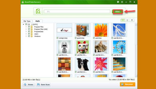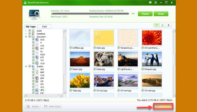 والآن سيبدأ البرنامج بعمله في استرجاع الملفات المحذوفة، وكما ذكرت في بداية التدوينة بأنه هذه نسخة تجريبية ويمكنك من خلالها استعادة حجم معين من الملفات لكي يتم استردادها، وبعد الانتهاء من عملية البحث يمكنك التأكد من استرجاع الملفات الخاصة بك عبر الاطلاع على القائمة الجانبية وبمجرد رغبتك في استعادة أي ملف من الملفات تقوم بتحديده والضغط على Recover التي تتواجد في الجانب وبعده عليك اختيار المكان الذي ستحفظ فيه الملف على حاسوبك.