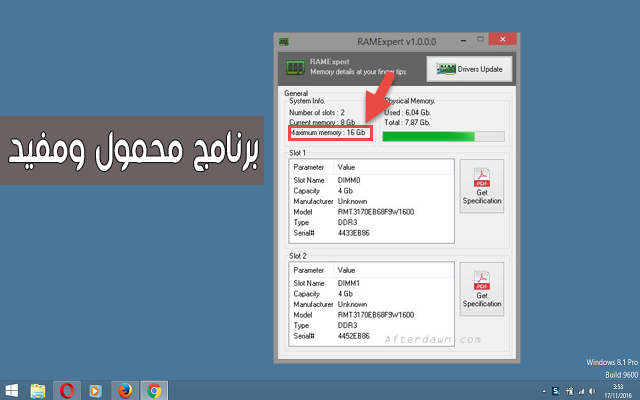 الطريقة سهلة وبسيطة وتكمن في برنامج صغير اسمه Ramexpert والذي تستطيع تحميله من خلال الرابط الذي تركته أسفل هذه التدوينة، فبعد تحميل البرنامج وفك الضغط عنه ستجد بأنه برنامج محمول ولا يحتاج للتثبيت، تقوم بفتحه لتجد كافة المعلومات التي تخص حاسوبك وخصوصاً حول الرامات الموجودة حالياً وكذلك ستجد بجانب خانة "Maximum memory" والتي تعني الكمية القصوى للرامات سعة الرامات القصوى التي يمكنك إضافتها للحاسوب في حال أردت أن تطور الحاسوب الخاص بك، وهذه تعتبر من أسهل الطرق لمعرفة كمية الرامات التي تستطيع إضافتها لأي حاسوب من خلال هذا البرنامج الصغير والمفيد الذي أتمنى أن يعجبكم ويفيدكم. لتحميل الاداة : اضغط هنا