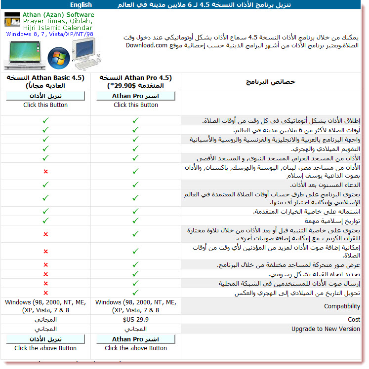 | <div> ![]() ![]() اســم الــبــرنــامــج وإصــدارة Athan Pro 4.5 حـــــجـــــم الـــبـــرنـــامــــج 16 MB توافق البرنامج ![]() معلومات عن البرنامج : - إطلاق الأذان بشكل أتوماتيكي في كل وقت من أوقات الصلاة. - أوقات الصلاة لأكثر من 6 ملايين مدينة في العالم. - واجهة البرنامج متعدد اللغات منها : العربية والانجليزية والفرنسية والروسية والأسبانية - التقويم الميلادي والهجري. - الأذان من المسجد الحرام, المسجد النبوي, و المسجد الأقصى - الأذان من مساجد مصر، لبنان, البوسنة والهرسك, باكستان, والأذان بصوت الداعية يوسف إسلام - الدعاء المسنون بعد الأذان. - يحتوي البرنامج على طرق حساب أوقات الصلاة المعتمدة في العالم الإسلامي وإمكانية اختيار أي منها. - اشتماله على خاصية الخيارات المتقدمة. - تواريخ إسلامية مهمة - يحتوي على خاصية التنبيه قبل أو بعد الأذان من خلال تلاوة مختارة للقرآن الكريم ، مع إمكانية إضافة صوتيات أخرى. - إمكانية إضافة صوت الأذان لمزيد من المؤذنين لأي وقت من أوقات الصلاة. - عرض صور متحركة لمساجد مختلفة من خلال البرنامج. - تحديد اتجاه القبلة بشكل رسومي. - إرسال صوت الأذان للمستخدمين في الشبكة المحلية - تحويل التاريخ من الميلادي إلى الهجري والعكس إثبات النسخة ![]() الفرق بين النسخة المجانية والمدفوعة : ![]() تحميل البرنامج : ![]() |