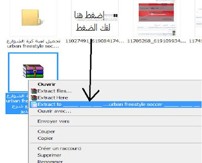 | <div>تحميل لعبة كرة الشوارع برابط واحد طريقة التثبيت : أول شيء اللعبة هي على شكل ونرار لذلك عليك القيام بفك الضغط كما هومبين في الصورة ثاني شيء بعد فك الضغط ستحصل على ملف بإسم اللعبة تقوم بالضغط عليه ثم تضعط هنا على (ُExtract here) بعد ذلك ستحصل على ملف جديد بإسم اللعبة (Urban Freestyle Soccer) ثم تقوم بالضغط على اللعبة كما هو مبين في الصورة