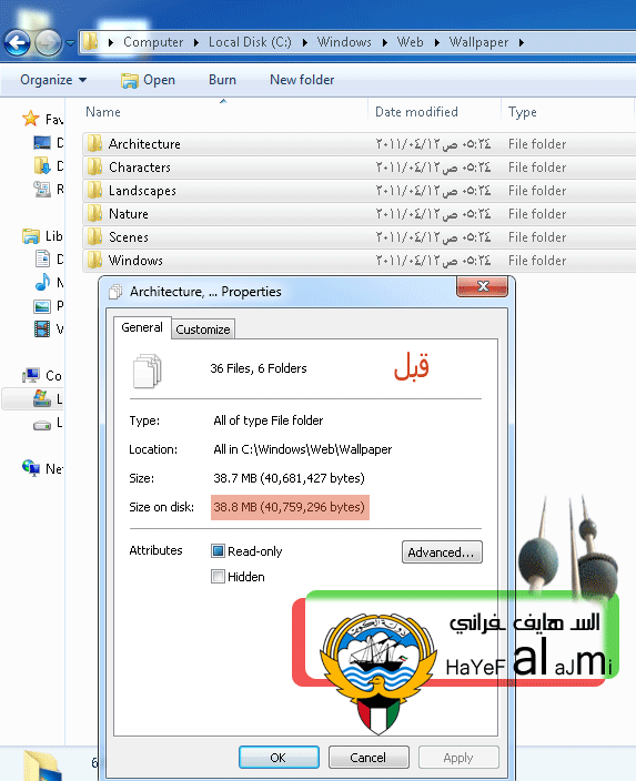 C:\Windows\Web\Wallpaper ويوجد ملفات كل ملف له خاصيته المهم - خمس ملفات تخص الخلفيات و ملف - Windows يخص الصوره الثابته للسطح المكتب المهم يا اخوان واخوات الموضوع ان الصور حجمها ثقيل ولبد من رفع صور اقل من حجمها الحالي وكمثال 1.17 MB والافضل يكون اقل من 676 KB وانتبه عند التعديل لهم بالمسميات لصوره والصيغه والحجم مهم قبل ![]() بعد ![]() وسلامتكم |