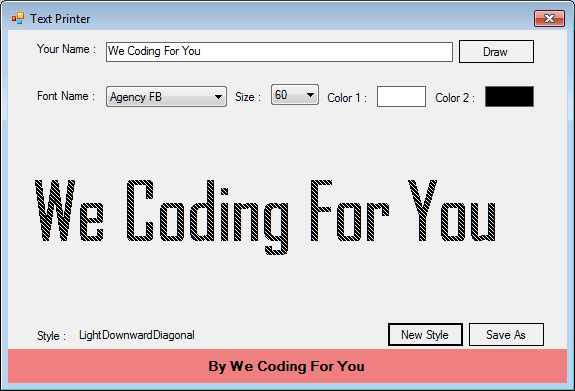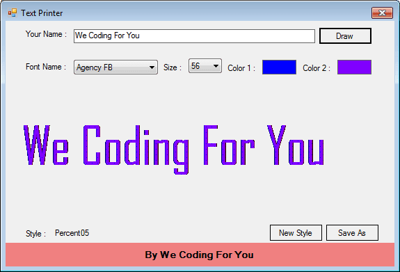 | السلام عليكم احبتي اليوم وجدت في موقع احبتي الكود المصدري لبرنامج TextPrinter الرائع في صنع النصوص بلغة سي شارب وهذه صور البرنامج ![]() ![]() ![]() ![]() رابط تحميل البرنامج مع الكود - الحجم لا يتعدى 1MB Text Printer Source Code - We Coding For You __DEFINE_LIKE_SHARE__ |