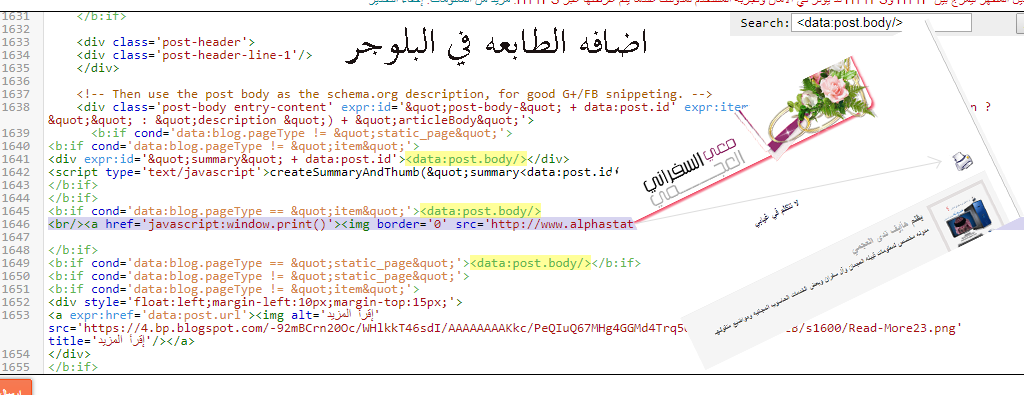 ================================== ابحث عن هذا فوقه ضع هذا ================================= < style media='print' type='text/css'> header, #header-wrapper, #header, .header, #crosscol-wrapper, #crosscol, .tabs-inner, aside, #sidebar, #sidebar-wrapper, .sidebar, .post-footer, footer, #footer-wrapper, #footer, .footer, .date-header, #comments, .comments, #backlinks-container, .feed-links, #blog-pager, #navbar-iframe {display:none} #main-wrapper {width:95%; overflow:visible !important;} *** هذا الاسهل والمميز ومن غير التطبيق الاول البحث عن هذا تحته ضع هذذا الكود ================================= هذا التطبيق يطلع بالمقدمه وبالموضوع انسخ المقاله وهذا الكود بالصوره ![]() ![]() ================================= وهذي مجموعه يمكن تحتاجها ![]() إذا وجدت 2 من هذا الكود فالثاني هو المقصود ================================= < data ost.body/>================================= ثم قم بإستبداله بأحد هذه الأكواد: < span class='noprint'></span> < b:if cond='data:blog.pageType == "item"'> < a href='javascript<b></b>:window.print()'> < /b:if> ================================= < span class='noprint'></span> < b:if cond='data:blog.pageType == "item"'> < a href='javascript<b></b>:window.print()'> < /b:if> ================================= < span class='noprint'></span> < b:if cond='data:blog.pageType == "item"'> < a href='javascript<b></b>:window.print()'> < /b:if> ================================= وهذا التطبيق هو الافضل وتبحث عن هذا وتضع الكود هذا تحته ================================= < b:if cond='data:blog.pageType == "item"'> < span style='background: url(صوره) left no-repeat; padding-left: 30px;'>اذا حبيت نسخ المقالهـ</span> < /b:if> ================================= |