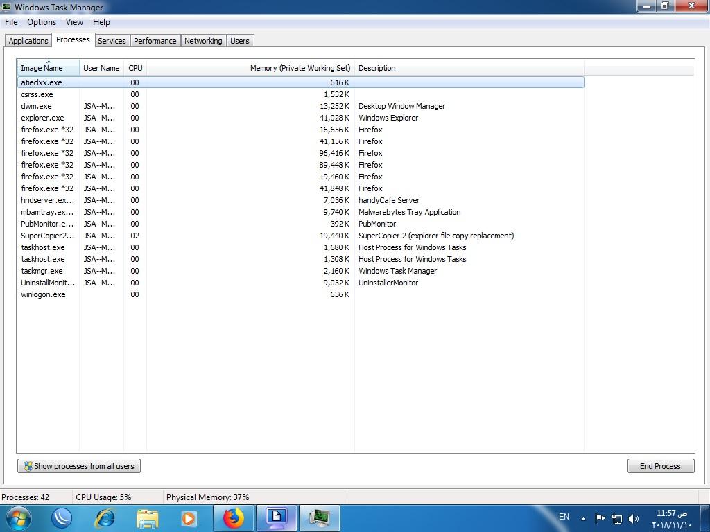 | <div> السلام عليكم ورحمة الله وبركاته شوفو صورة التاسك مانيجر وتكرار معالجة فاير فوكس اكثر من عمليه في نفس الوقت مع ان الرنامج مفتوح صفحه واحده بس أوقات بتكون أكثر من هذا العدد حتا يوصل الي 15 او 16 عملية في نفس الوقت ![]() ![]() نفس الموضوع مع المتصفحات والعاب أونلاين مثل لعبة Pubg Mobil مع محاكي الأندرويد الخاص بها مواصفات جهاز الكمبيوتر من فحص أداة dxdiag ------------------ System Information ------------------ Time of this report: 11/10/2018, 12:04:08 Machine name: JSA--MASTER-PC Operating System: Windows 7 Ultimate 64-bit (6.1, Build 7601) Service Pack 1 (7601.win7sp1_rtm.101119-1850) Language: Arabic (Regional Setting: Arabic) System Manufacturer: Dell Inc. System Model: OptiPlex 755 BIOS: Phoenix ROM BIOS PLUS Version 1.10 A19 Processor: Intel(R) Core(TM)2 Duo CPU E7300 @ 2.66GHz (2 CPUs), ~2.7GHz Memory: 4096MB RAM Available OS Memory: 3966MB RAM Page File: 1785MB used, 7948MB available Windows Dir: C:\Windows DirectX Version: DirectX 11 DX Setup Parameters: Not found User DPI Setting: Using System DPI System DPI Setting: 96 DPI (100 percent) DWM DPI Scaling: Disabled DxDiag Version: 6.01.7601.17514 32bit Unicode أرجو الرد السريع فضلا لا أمر . :sa: